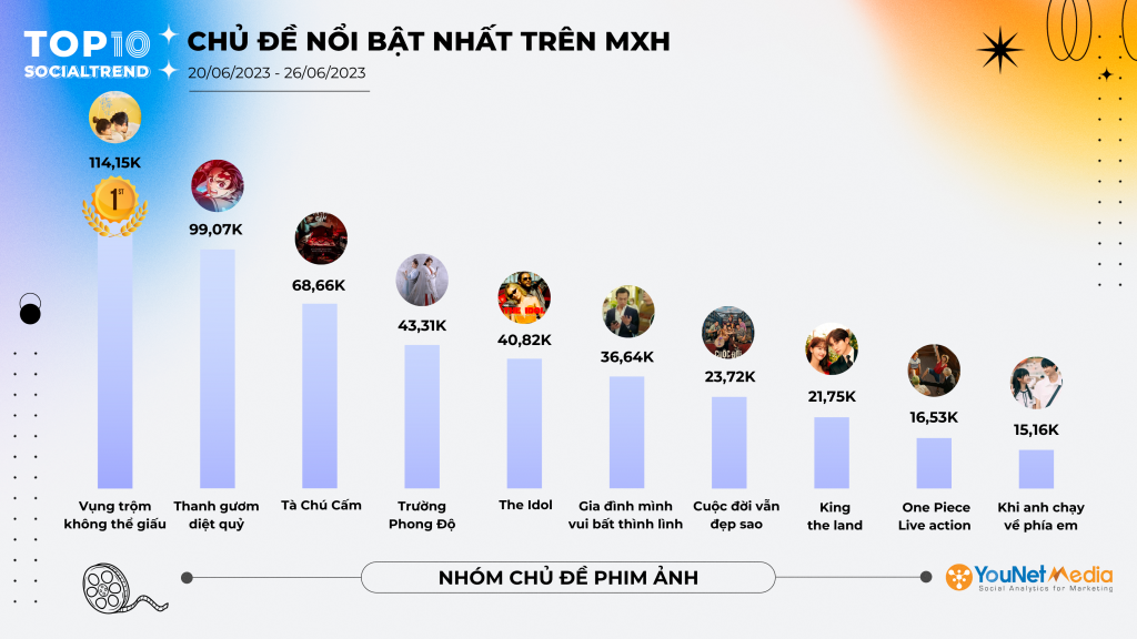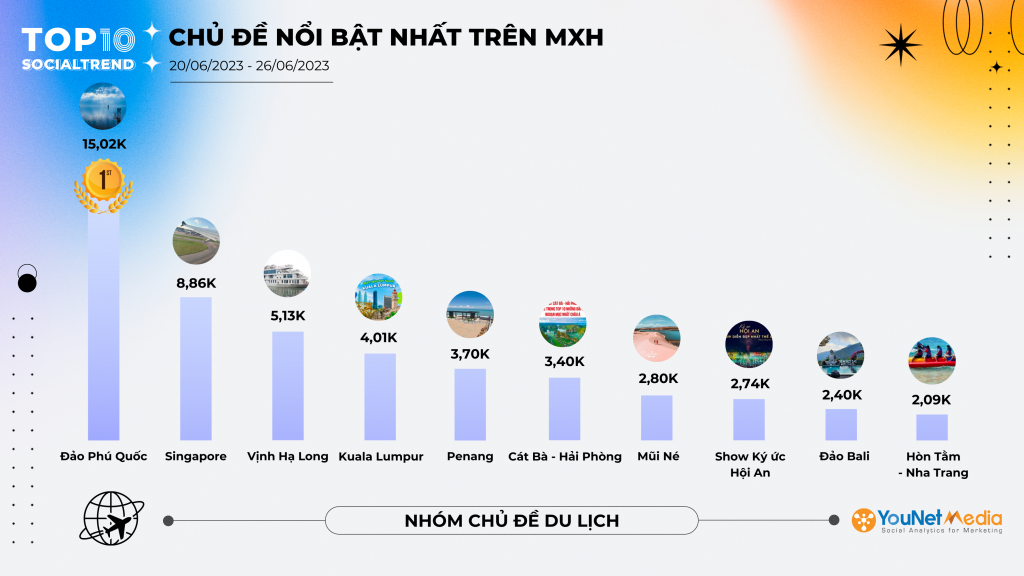 Trên đây là Top 10 những chủ đề thu hút thảo luận sôi nổi nhất trên MXH lĩnh vực Phim ảnh, Âm nhạc và Du lịch Tuần 20/06 – 26/06/2023. Để theo dõi những chủ đề trending nhất hàng tuần, hãy theo dõi các bài viết tiếp theo trên YouNet Media.