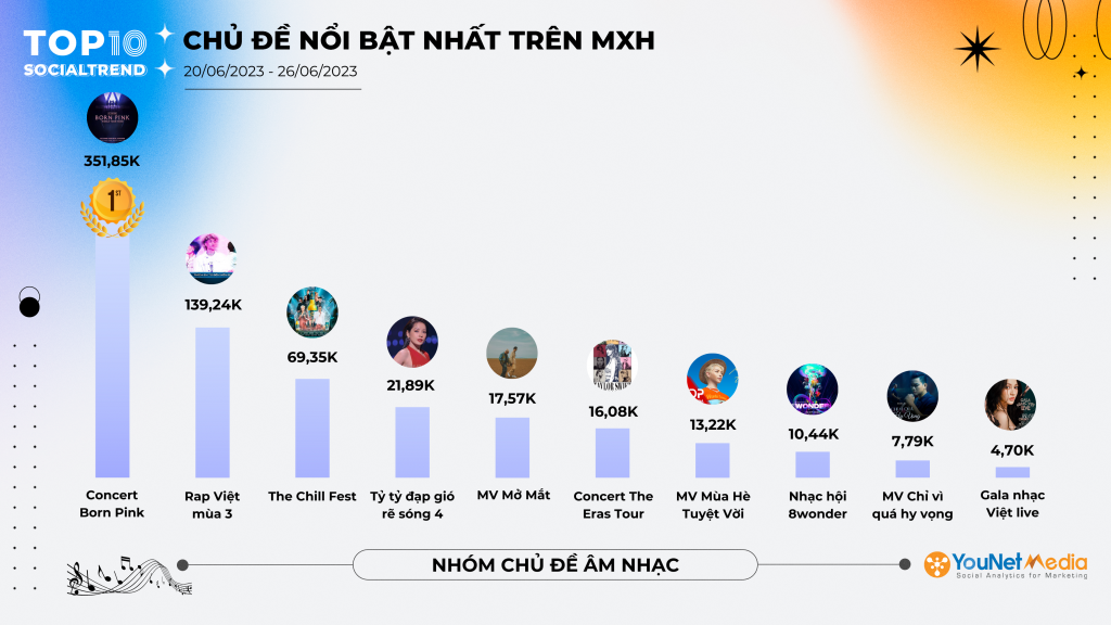 Tuần vừa qua, Mạng xã hội được phen “tưng bừng” với thông tin của hai siêu concert The Eras Tour của “rắn chúa” Taylor Swift tổ chức tại Singapore, và Born Pink của BLACKPINK diễn ra tại sân Mỹ Đình, Hà Nội cùng mở bán vé cùng ngày 7/7. Bên cạnh đó, các bộ phim Trung Quốc, Hàn Quốc vừa mới ra mắt như Vụng trộm không thể giấu, Trường phong độ, King the land. Đen bắt tay cùng với Lil Wuyn ra mắt MV Mở mắt, Đức Phúc hợp tác cùng Tăng Duy Tân trình làng MV Mùa hè tuyệt vời,… đã nhận được lượng lớn quan tâm từ người dùng MXH.