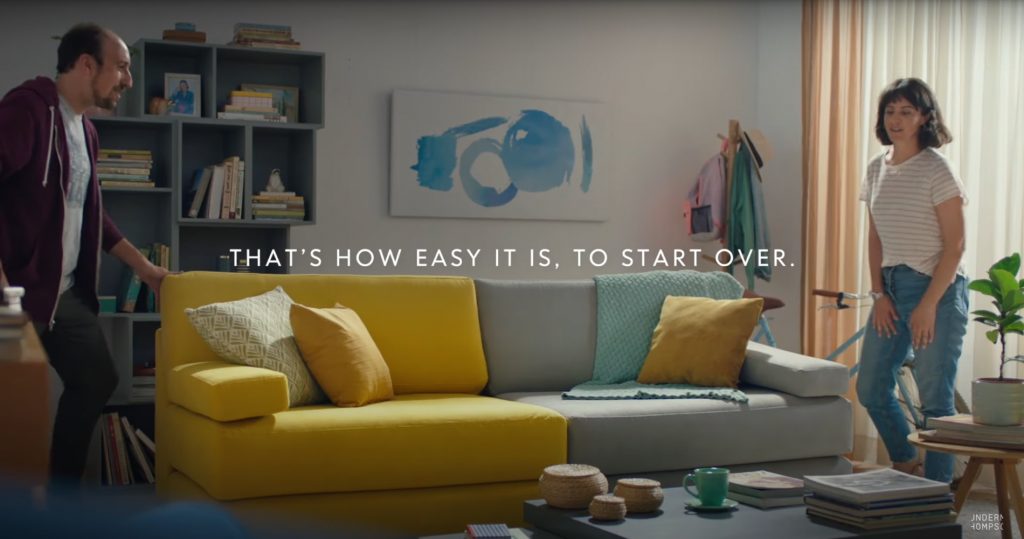 Trong chiến dịch được sản xuất bởi công ty quảng cáo Wunderman Thompson Lima này, bộ sưu tập nội thất kiểu mô-đun có thể tháo rời và chia đôi một cách dễ dàng nếu chủ nhân của chúng quyết định chia tay. Bạn không cần phải nói lời tạm biệt với chiêc sofa ưu thích của mình nữa, hãy yên tâm rằng một phần (hay chính xác là một nửa) của nó sẽ mãi mãi thuộc về bạn.