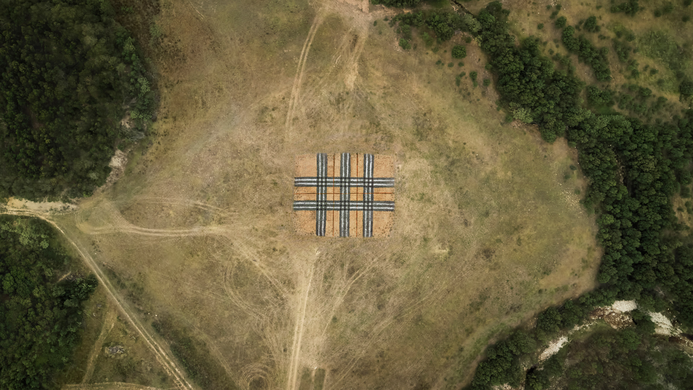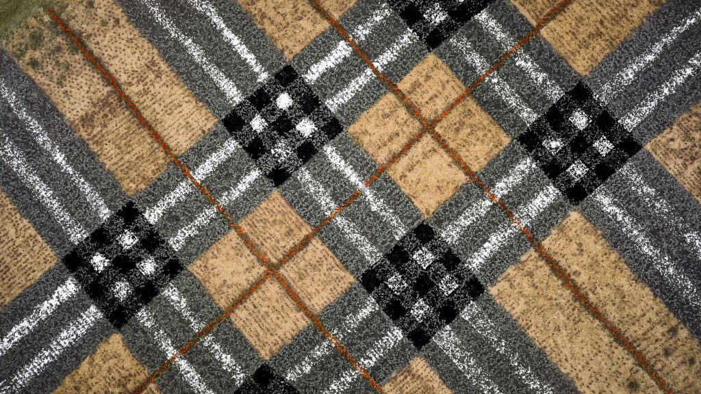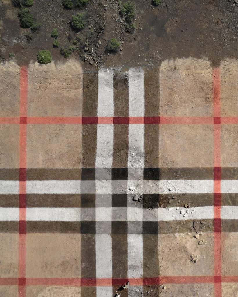 Khi được nhìn từ trên không, các dải hình màu be, đỏ, đen và trắng quen thuộc được trải trên phong cảnh nhấp nhô, bắt chước chiếc khăn ca rô cashmere của Burberry, một trong những phụ kiện nổi tiếng nhất của nhà mốt được giới thiệu lần đầu tiên vào những năm 1970.
