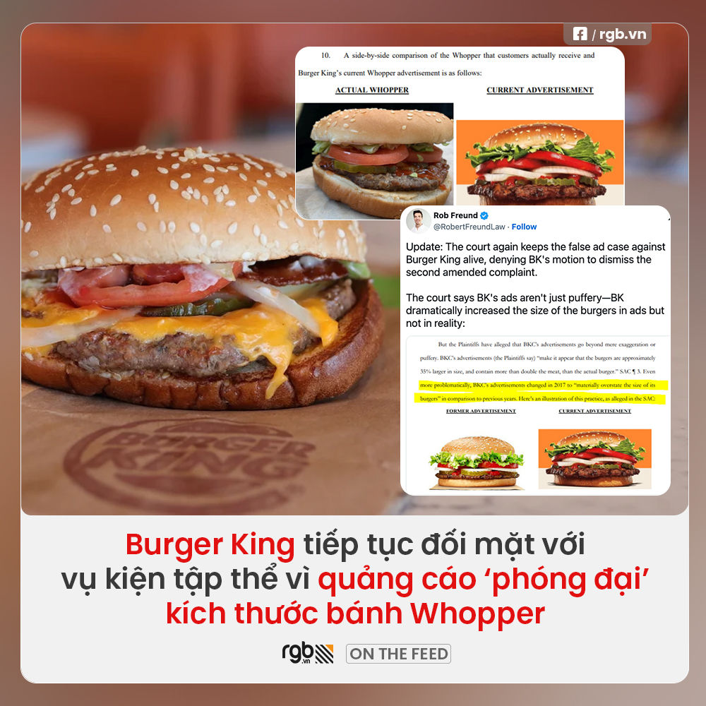 Whopper – chiếc bánh nổi tiếng của Burger King đang bị “mang ra nướng” tại tòa án vì cáo buộc quảng cáo sai lệch. Cụ thể, Burger King đang đối mặt với một vụ kiện tập thể từ 19 người tiêu dùng ở 13 bang tại Mỹ, cho rằng các hình ảnh quảng cáo Whopper đã bị “phóng đại” so với thực tế.
