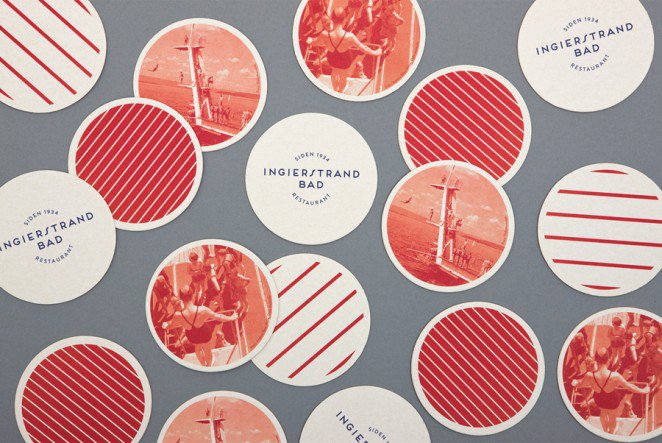 Ở thiết kế bộ nhận diện thương hiệu của nhà hàng Ingierstrand của Na-Uy, sự đồng bộ được thể hiện trong khi sử dụng, màu sắc và ý nghĩa của sắc Đỏ được kết hợp hài hòa bởi bố cục, sự rõ ràng, dễ hiểu và độ tương phản.