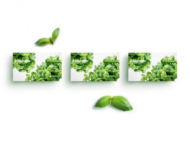 Business card cho nhà hàng Albahaca trong rất bắt mắt với hình ảnh màu Xanh lá cây sống động của loài rau trùng với tên của nhà hàng, thương hiệu của họ là tươi, tốt cho sức khỏe và đầy sức sống.