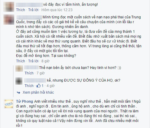 2. Mình thừa nhận đã hơi vội vàng trong việc crowdfunding sách, nhưng mình rất buồn vì khi mình hỏi ý kiến các bạn, rất ít người lên tiếng phản đối. Và chỉ sau khi mình mở dự án, các bạn mới phản đối ở một page khác, cũng không cho mình biết, mà mình chỉ gián tiếp biết qua Facebook. Tuy nhiên, mình cũng cảm ơn các bạn đã có tiếng nói để mình biết được những khuyết điểm này.