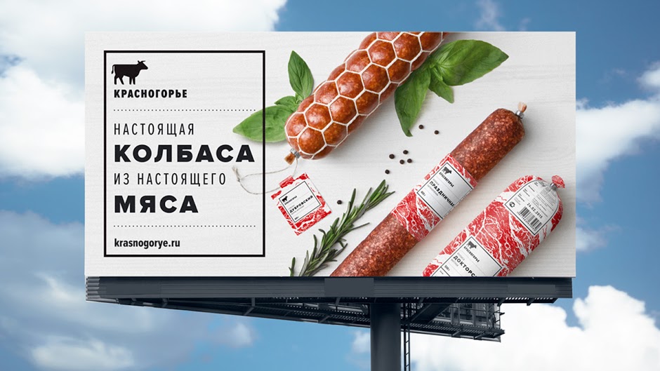 Thông tin và các chiến dịch quảng cáo cho Krasnogorie được chuẩn bị đơn giản tương tự như hình thức của nhãn sản phẩm. Với bố cục chặt chẽ kết hợp với yếu tố đồ hoạ như đường line đen phân chia các không gian và những biểu tượng minh hoạ chính là điểm mạnh của công ty sản phẩm thịt. Từ những điểm mạnh đó đã góp sức tạo nên sự đa dạng về thành phần và duy trì các cấu trúc bố cục ấy.