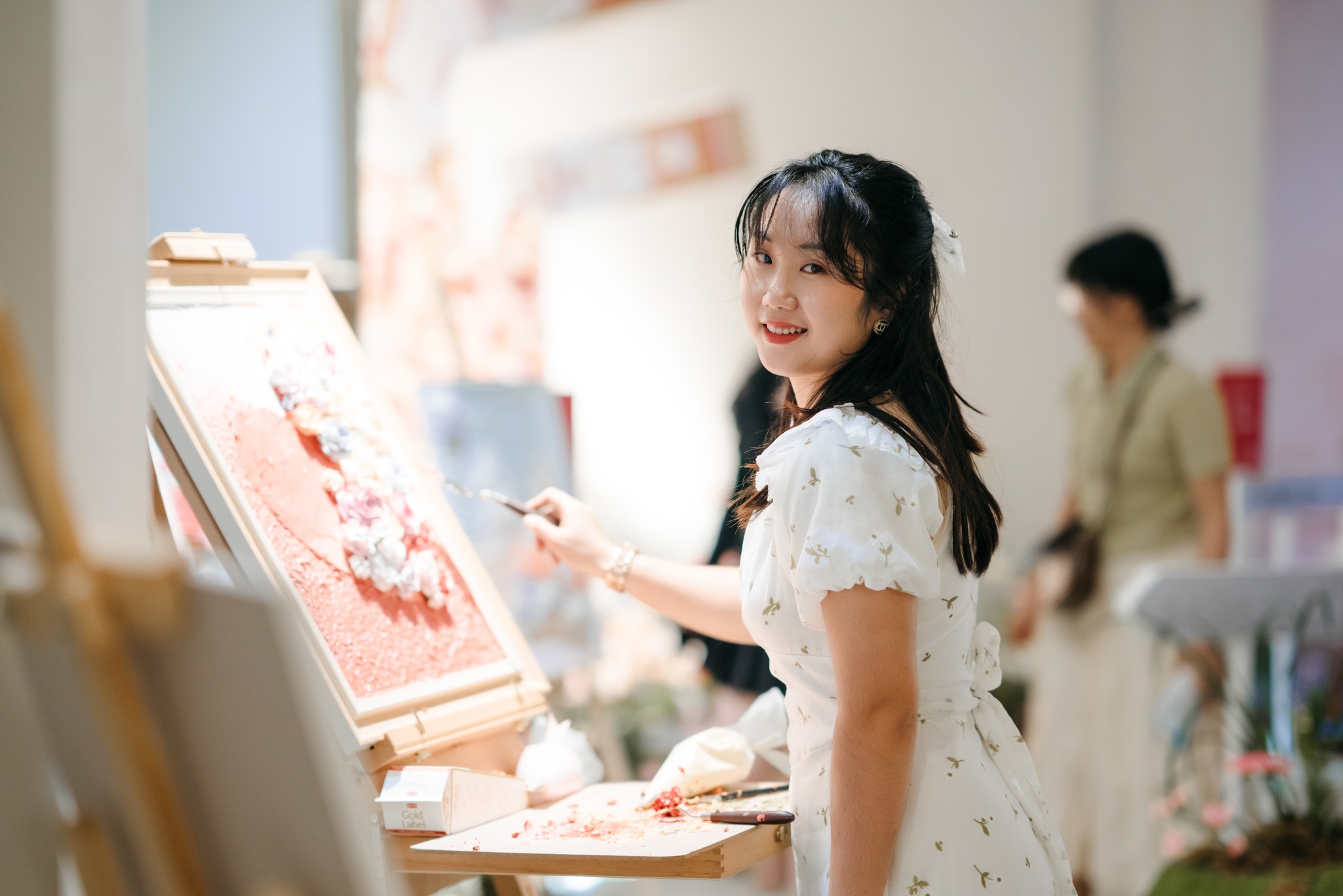 Tiếp theo, tại khu “Art in Blooms”, sự sáng tạo chưa bao giờ có giới hạn. Là tranh nhưng không được tạo nên từ cọ vẽ mà dùng chính kem làm bánh để khắc họa sống động các vườn hoa tràn ngập hương sắc quả thực đã khiến người xem đi từ bất ngờ này đến bất ngờ khác. Chưa hết, tại khu vực này, người đến tham dự còn được tự tay hoàn thiện bức tranh “tình yêu” với gam chủ đạo là màu hồng lãng mạn.