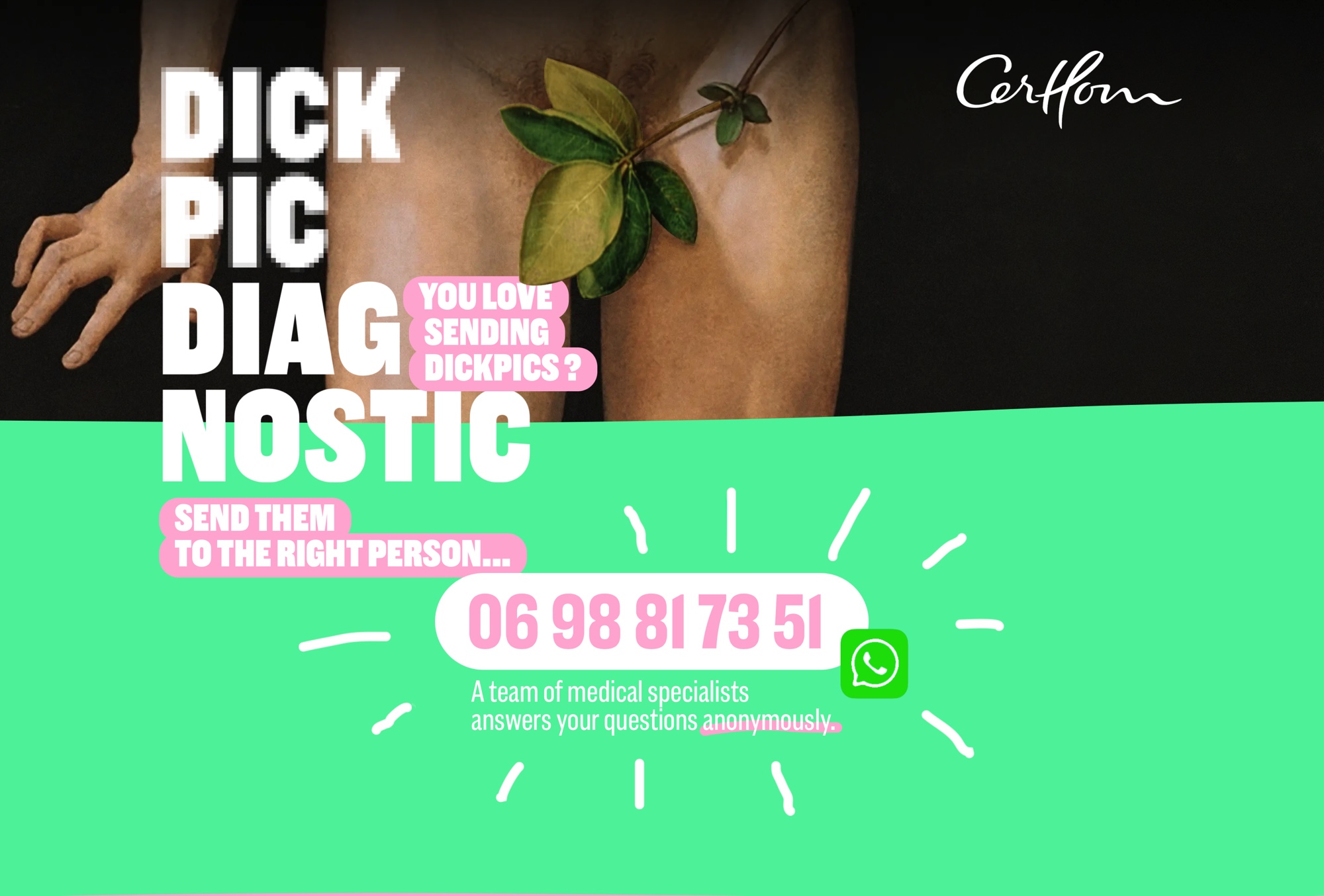 Sau đó họ còn được khuyến khích hãy gửi ảnh “hoạ mi” của mình qua số Whatsapp 06 98 81 73 51 để được tư vấn ẩn danh và miễn phí hoặc đặt câu hỏi trên trang web dickpic-diagnostic.com.