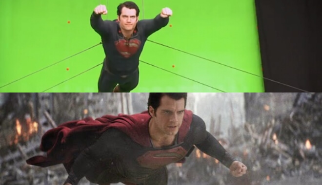 Ai cũng biết rằng Henry Cavill trong Man of Steel thật sự không thể bay. Hình ảnh này cho thấy làm thế nào anh ấy đạt được cảnh bay mang tính biểu tượng của Siêu Nhân, đơn giản là sử dụng dây và phông xanh. Thậm chí áo choàng siêu nhân cũng được thêm vào ở phần hậu kỳ.