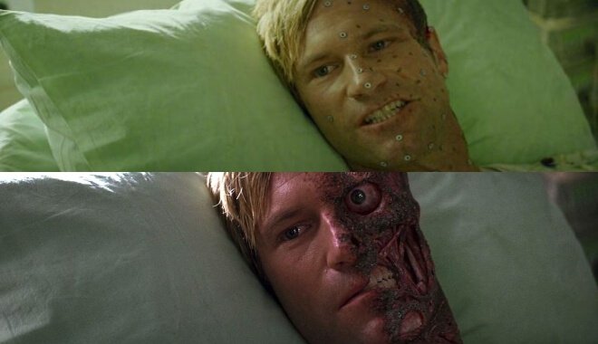 Những hiệu ứng có phần kinh dị được sử dụng cho khuôn mặt của Aaron Eckhart trong The Dark Knight khiến bạn tin rằng anh ấy có hai khuôn mặt hoàn toàn khác biệt.