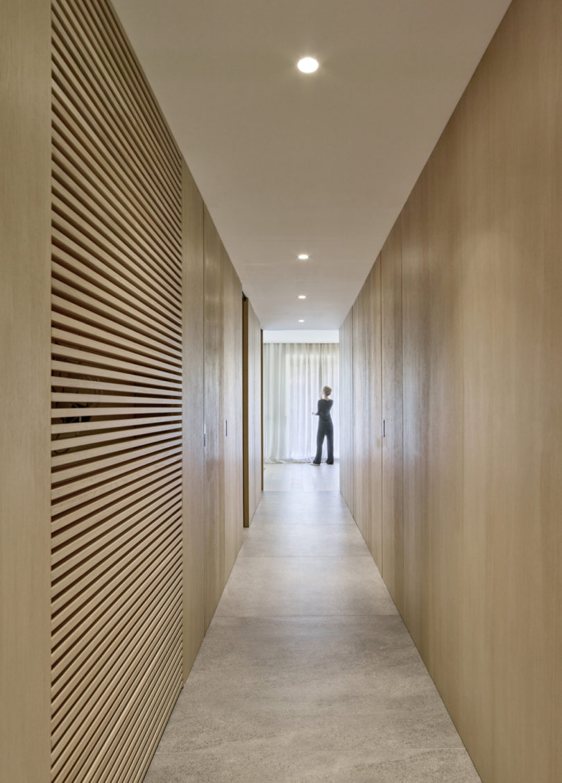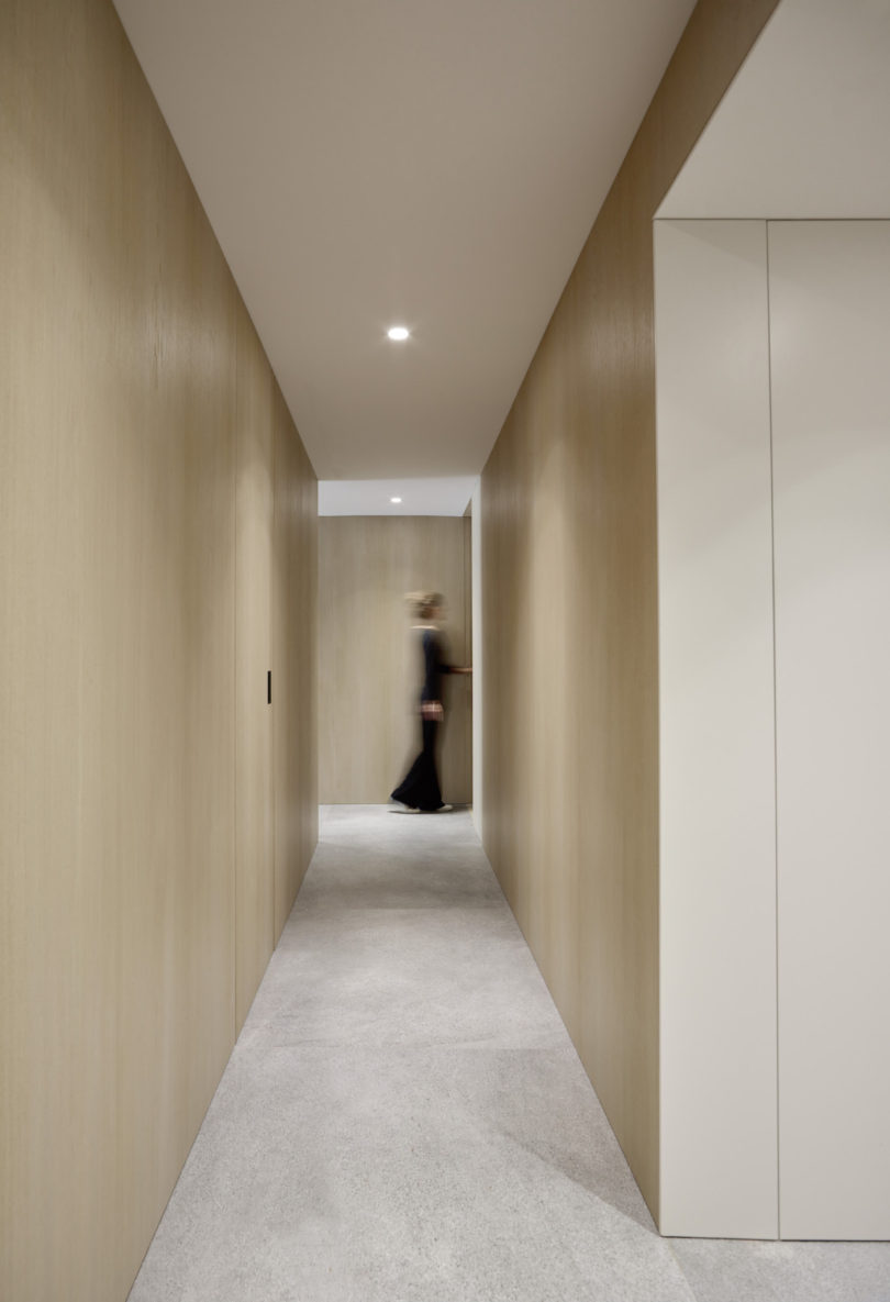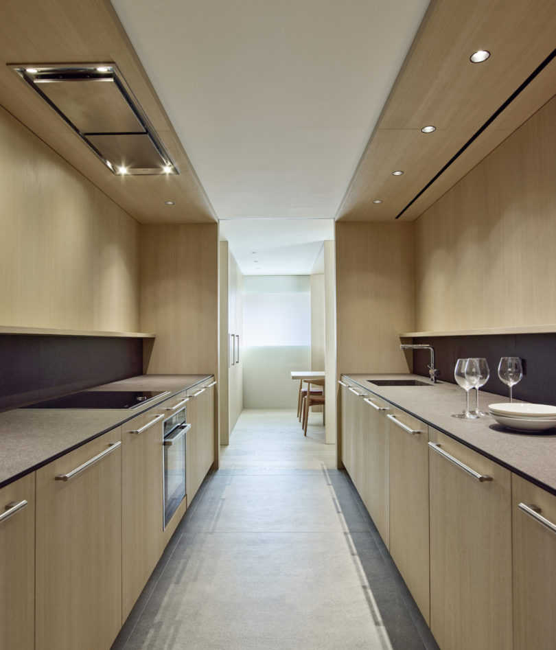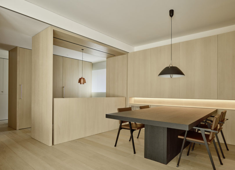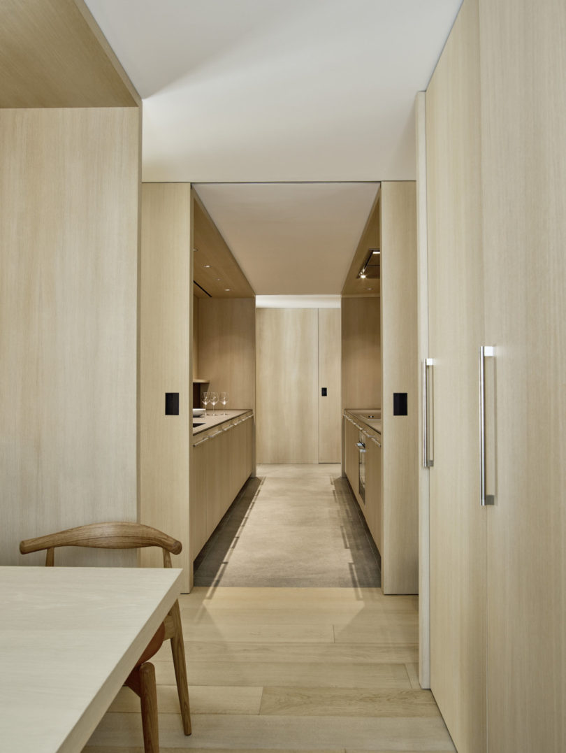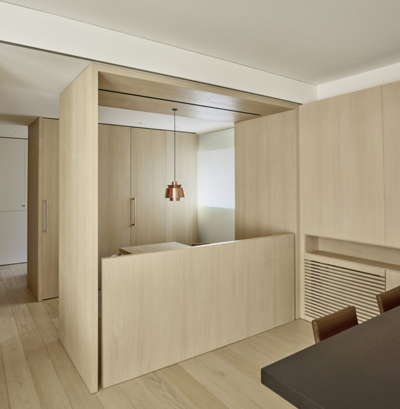 Hành lan hình chữ L với nhà tắm được đặt ẩn và liên kết các phòng của căn hộ với hệ thống của trượt có chức năng tương tự các bức tường. Bếp được thiết kế độc đáo và có thể hoạt động linh hoạt khi cần thiết. Các phòng được phân chia chú yếu gồm phòng ăn, phòng sinh hoạt, thư viện, ghế sofa,… như cách sắp đặt truyền thống.