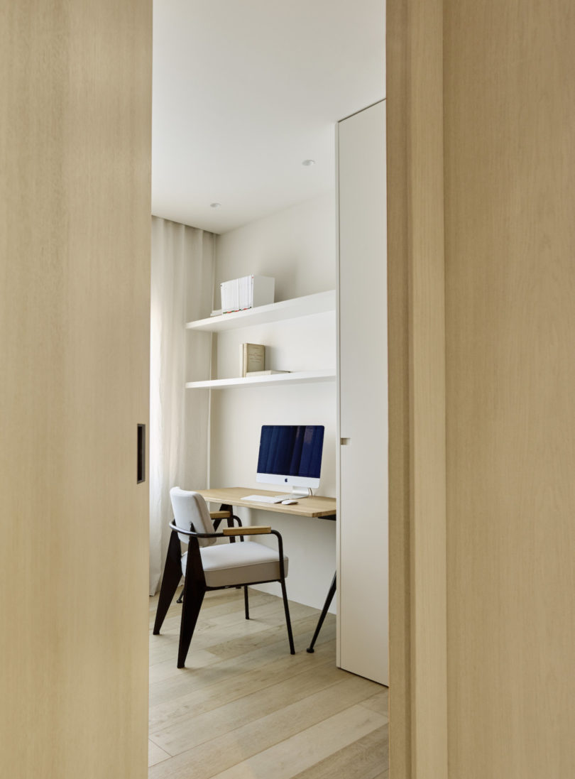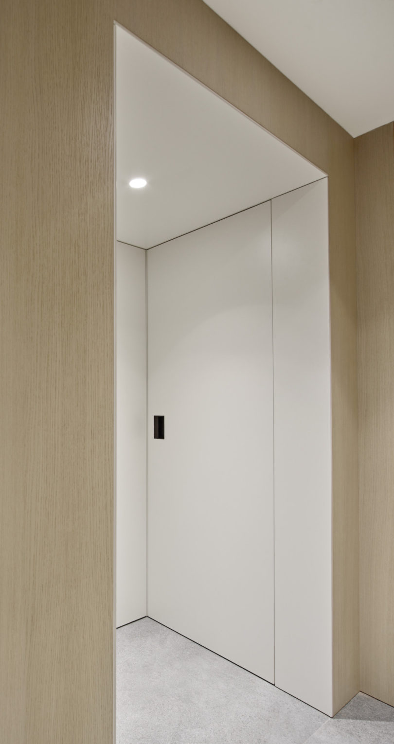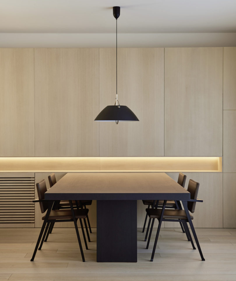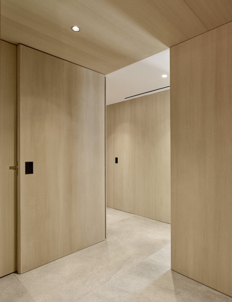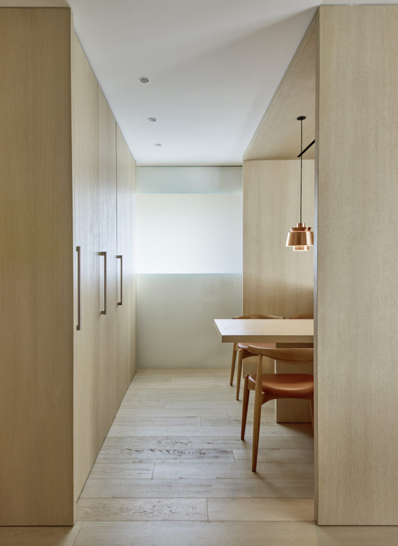 Hành lan hình chữ L với nhà tắm được đặt ẩn và liên kết các phòng của căn hộ với hệ thống của trượt có chức năng tương tự các bức tường. Bếp được thiết kế độc đáo và có thể hoạt động linh hoạt khi cần thiết. Các phòng được phân chia chú yếu gồm phòng ăn, phòng sinh hoạt, thư viện, ghế sofa,… như cách sắp đặt truyền thống.