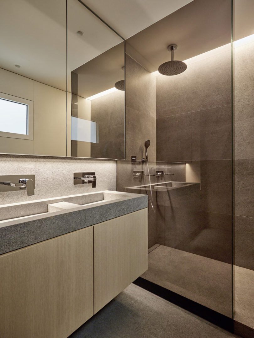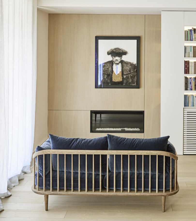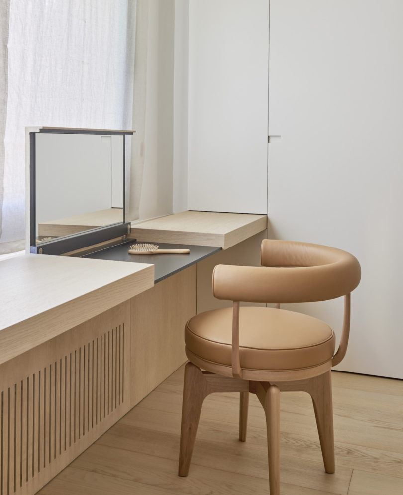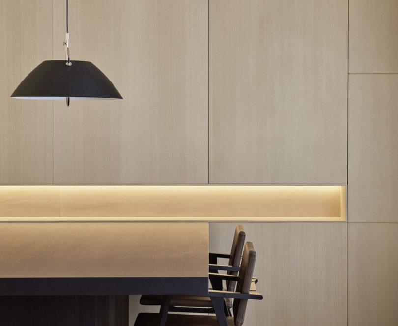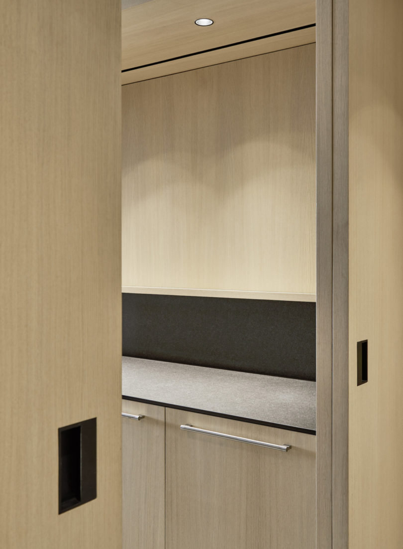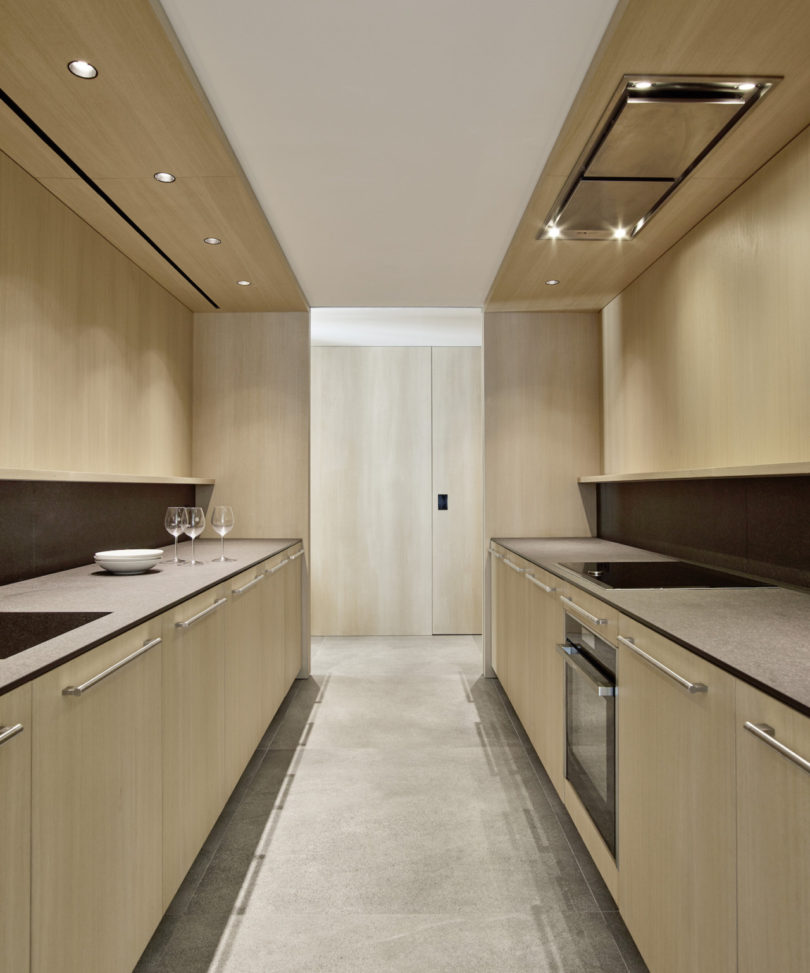 Hành lan hình chữ L với nhà tắm được đặt ẩn và liên kết các phòng của căn hộ với hệ thống của trượt có chức năng tương tự các bức tường. Bếp được thiết kế độc đáo và có thể hoạt động linh hoạt khi cần thiết. Các phòng được phân chia chú yếu gồm phòng ăn, phòng sinh hoạt, thư viện, ghế sofa,… như cách sắp đặt truyền thống.