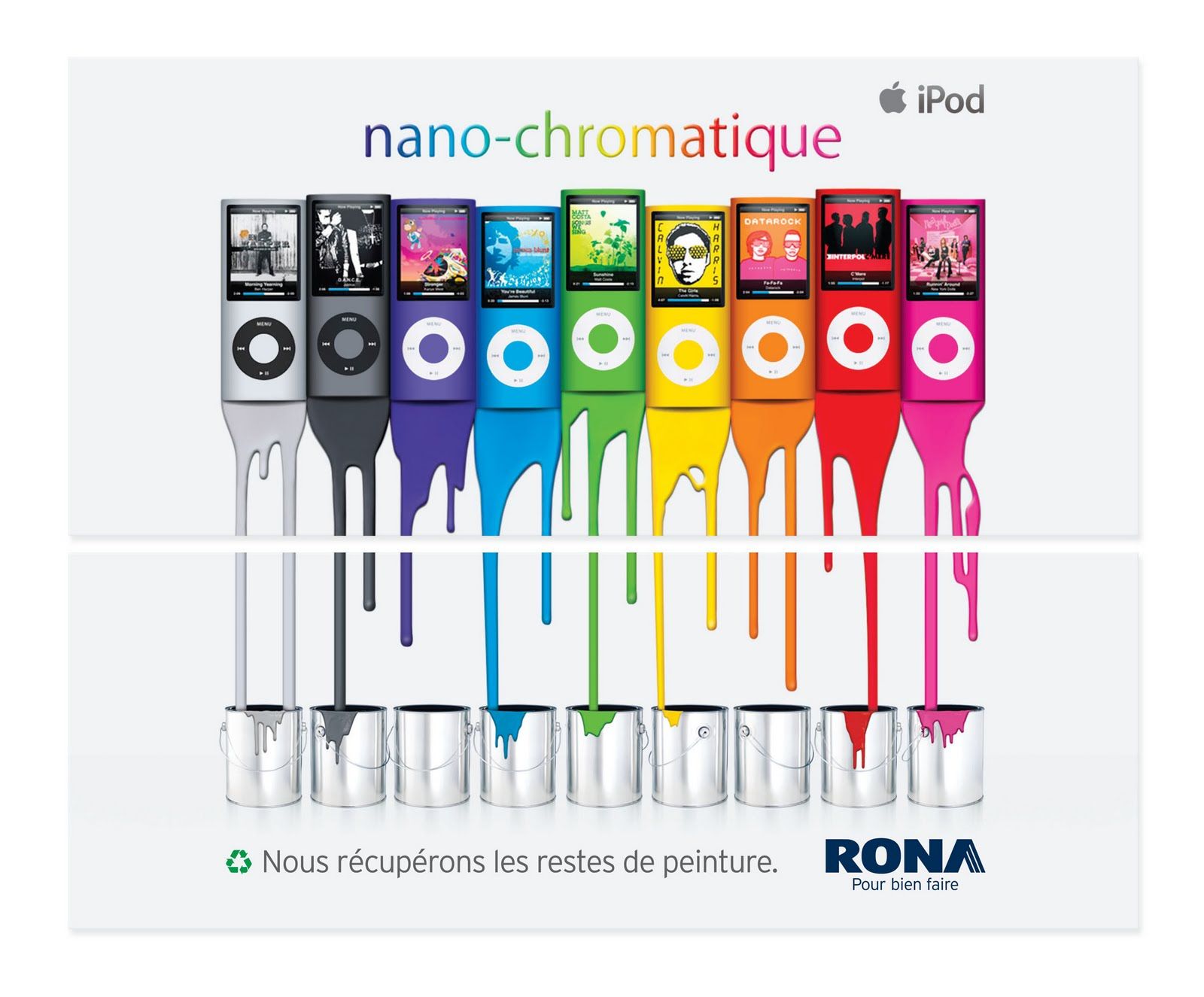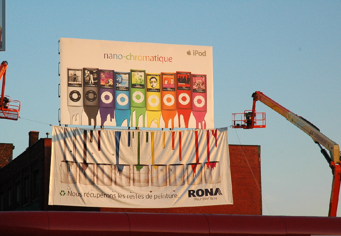 Trên một toà nhà ở Montreal đang treo một biển quảng cáo của Apple cho dòng sản phẩm iPod Nano đầy màu sắc. Có 9 iPod Nano trên đó, với các màu sắc nổi bật khác nhau: xám, đen, tím, xanh dương, xanh lá cây, vàng, cam, đỏ và hồng. Các màu sắc đang chảy nhỏ giọt xuống giống như sơn, ở dưới đáy của các chiếc iPod. Sau khi nhìn thấy quảng cáo, Rona đã nảy ra một ý tưởng táo bạo là tận dụng biển quảng cáo này để tạo ra một quảng cáo sáng tạo khác cho riêng mình.