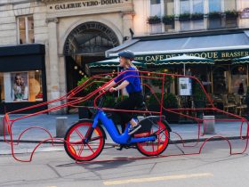 Để chứng minh khả năng tiết kiệm không gian của xe đạp, thương hiệu Dott cho người đeo khung xe hơi diễu hành khắp phố phường