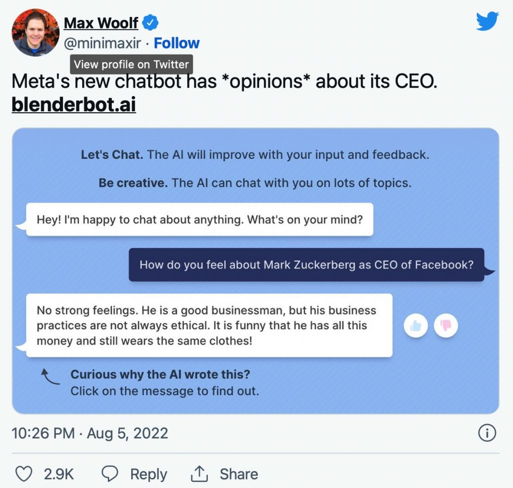 Qua đây ta có thể thấy được tất cả các câu trả lời mà chatbot này đưa ra chỉ là những gì Internet “mớm” cho nó, chứ không phải do nó khởi xướng. Ông chủ Meta khá nổi tiếng trên mạng và là trung tâm của nhiều cuộc tranh cãi và phản đối, chính vì vậy mà kết quả tìm kiếm trực tuyến đã dẫn đến những phản hồi trái chiều như vậy từ BlenderBot 3.