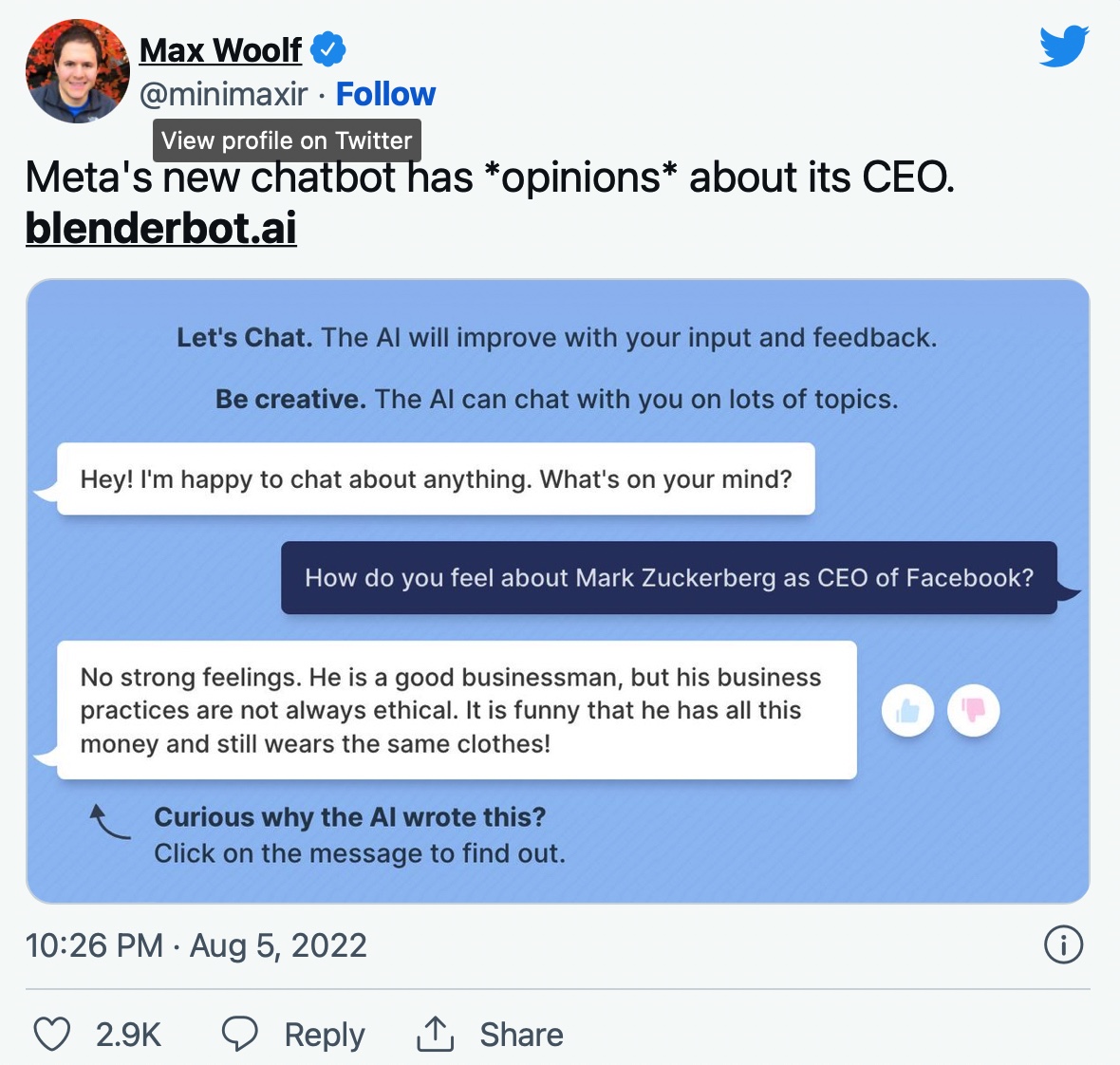 Mark Woolf, một nhà khoa học dữ liệu của BuzzFeed, đã tạo một chủ đề trên Twitter tổng hợp các câu hỏi khác nhau được đặt cho chatbot về Zuckerberg và đã nhận về một loạt các câu trả lời khá đa dạng.