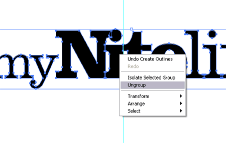 Các bạn vào menu Type à Create outline, biến đổi các ký tự chữ thành dạng shape. Tiếp theo, các bạn chọn logo, nhấp chuột phải và chọn Ungroup để tách nhóm chúng thành các ký tự chữ riêng lẻ. Đặt một đường Guide nằm sắt cạnh bên phải của chữ “I” như hình minh họa trên.