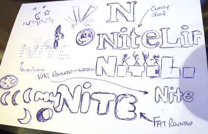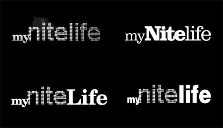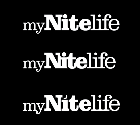 Phiên bản logo được chọn toàn bộ đều sử dụng dạng chữ Slab-Serif, điểm này đã được tôi tập trung vào và chỉnh sửa đôi chút để tạo thành 2 phiên bản logo mới. Chỉnh sửa đầu tiên là giảm bớt khoảng cách giữa các cặp ký tự chữ trong logo ( Hiệu chỉnh Kerning) làm cho các ký tự nối vào nhau. Chỉnh sửa thứ hai là thay đổi dấu chấm trên ký tự “I” trong từ Nite thành hình trăng lưỡi liềm để miêu tả yếu tố thời gian ban đêm.