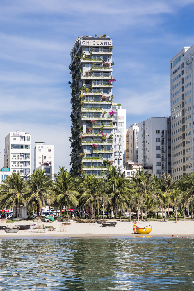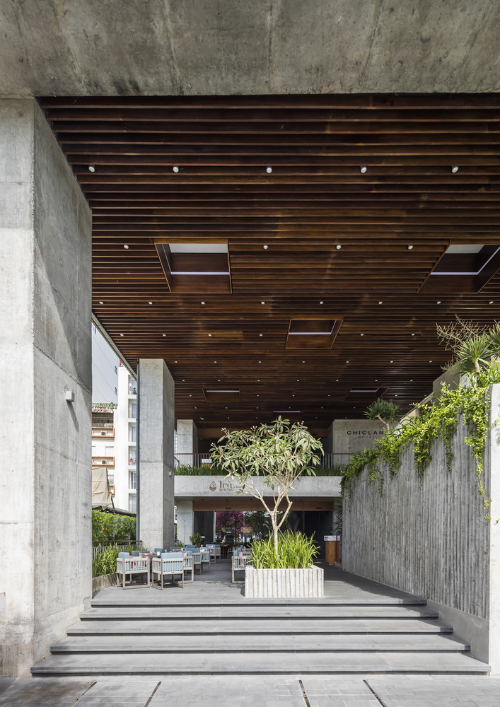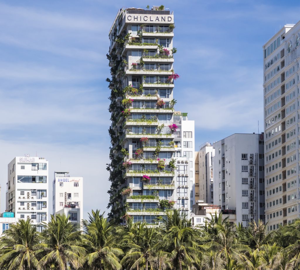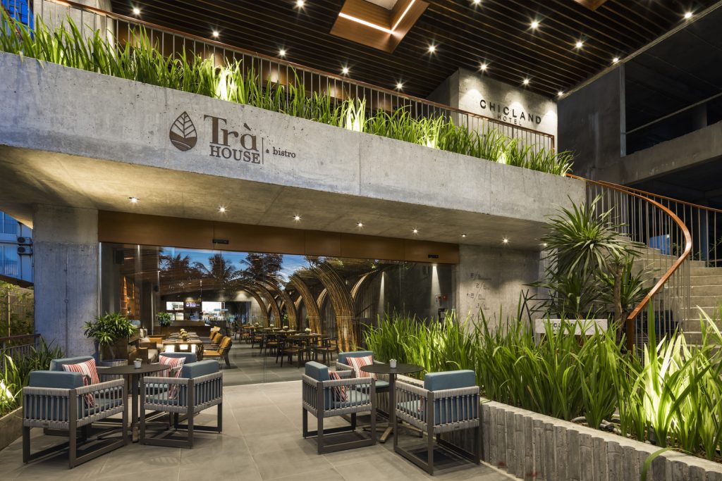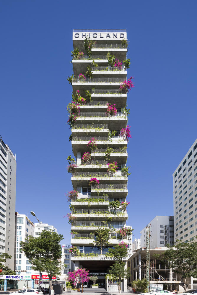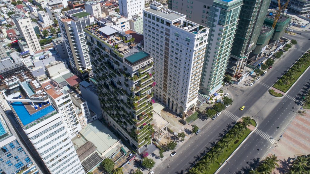 Khách sạn Chicland được thiết kế để đáp ứng yêu cầu kinh doanh của khách hàng nhưng không giới hạn kiến trúc theo phong cách thương mại thông thường. Tất cả các bộ phận kỹ thuật theo chiều dọc được chuyển đến khu vực phía Bắc để đảm bảo tầm nhìn rõ ràng (trong tương lai gần, sẽ có một tòa nhà cao tầng bên cạnh ở phía Bắc). Các mặt đứng khác được bao phủ bởi hệ thống chậu cây xen kẽ đầy cảm hứng bất ngờ được tích hợp vào ban công hoặc phần trượt của các phòng khách sạn. Hệ thống cây xanh này có thiết kế đơn giản, dễ vận hành và bảo dưỡng.