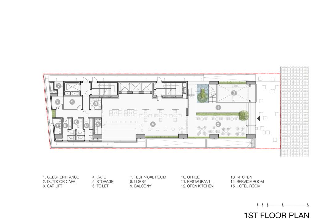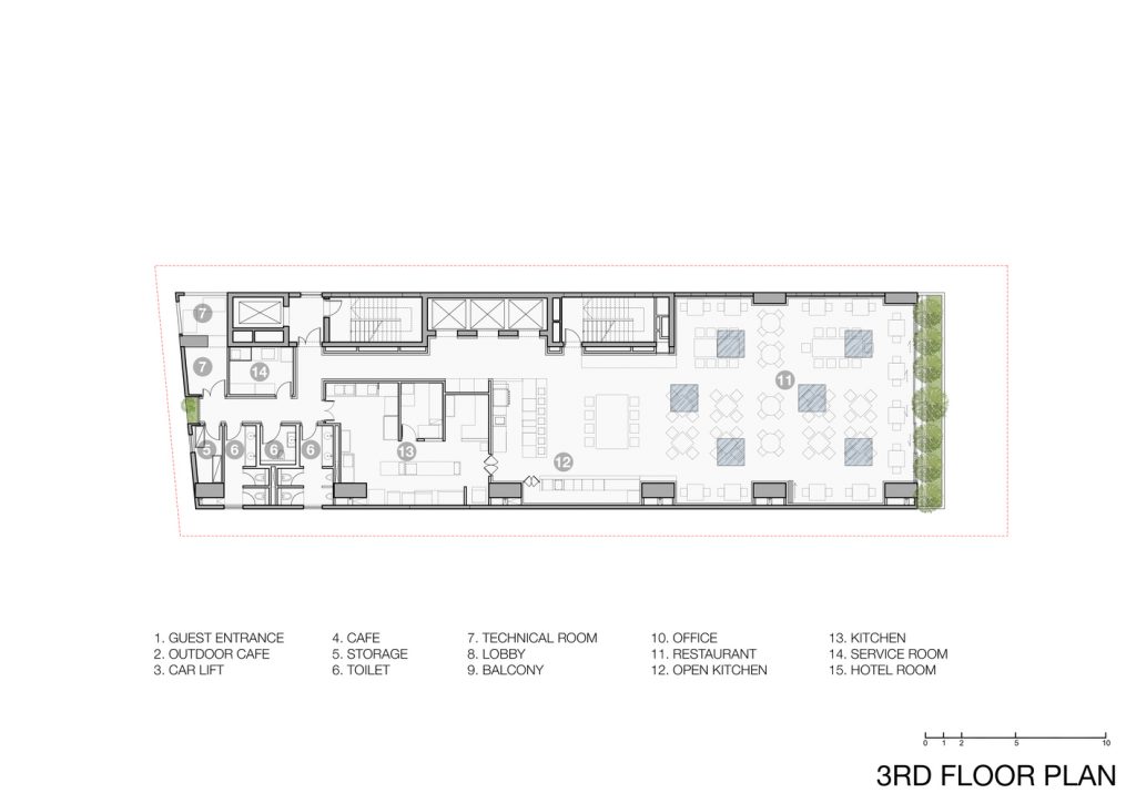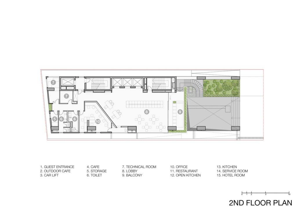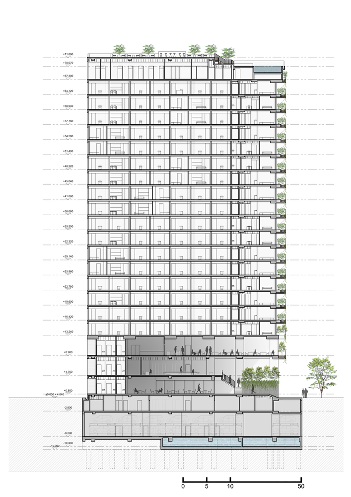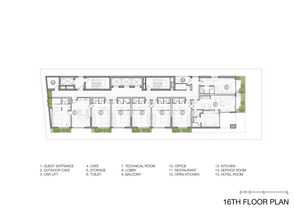 Khách sạn Chicland được thiết kế để đáp ứng yêu cầu kinh doanh của khách hàng nhưng không giới hạn kiến trúc theo phong cách thương mại thông thường. Tất cả các bộ phận kỹ thuật theo chiều dọc được chuyển đến khu vực phía Bắc để đảm bảo tầm nhìn rõ ràng (trong tương lai gần, sẽ có một tòa nhà cao tầng bên cạnh ở phía Bắc). Các mặt đứng khác được bao phủ bởi hệ thống chậu cây xen kẽ đầy cảm hứng bất ngờ được tích hợp vào ban công hoặc phần trượt của các phòng khách sạn. Hệ thống cây xanh này có thiết kế đơn giản, dễ vận hành và bảo dưỡng.
