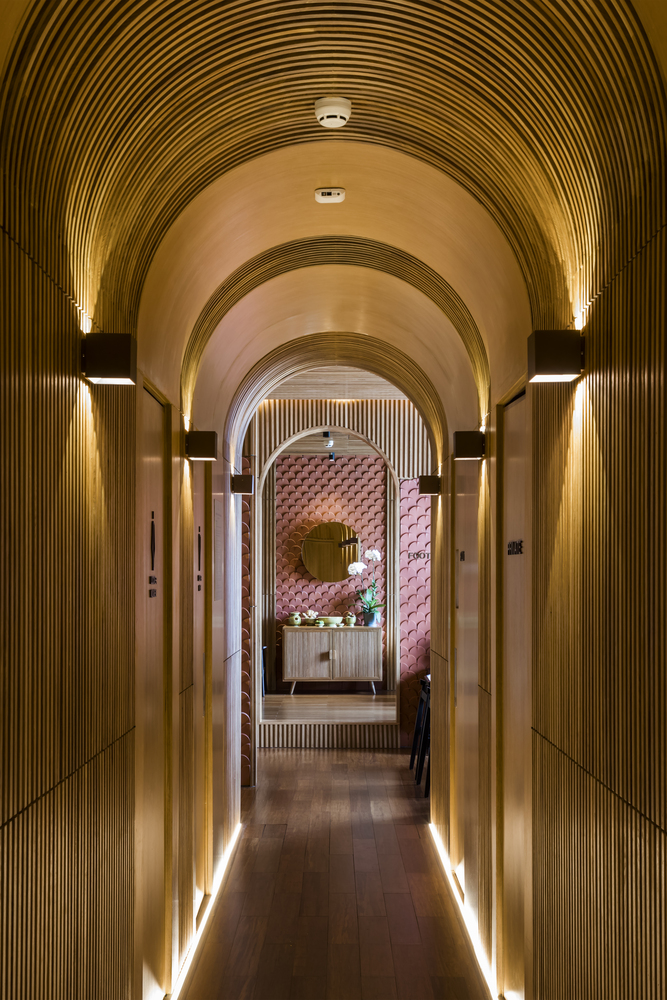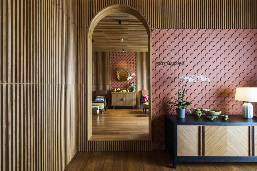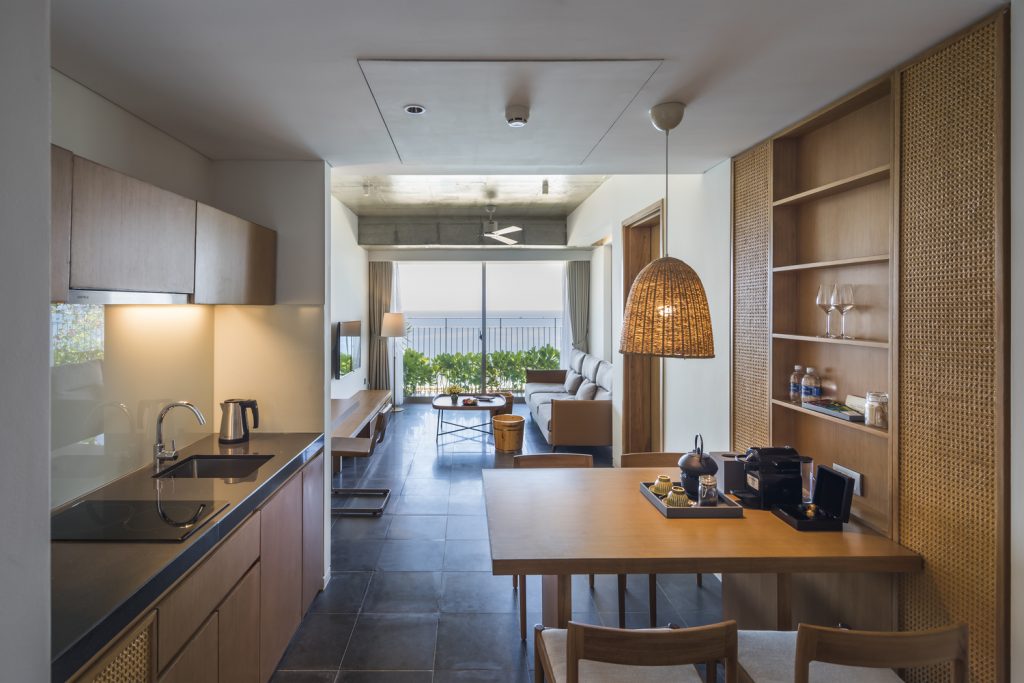 Tường được làm bằng vật liệu chính là bê tông và được bao phủ bởi hệ thống cây xanh nhiệt đới. Mặt tiền xanh tạo cảm hứng cho thiết kế nội thất. Nội thất và vật liệu trang trí nội thất được làm từ vật liệu địa phương hoặc tự nhiên: gỗ, đá, tre, nứa, mây … Phòng khách được thiết kế với phòng vệ sinh mở liên thông với phòng ngủ. Tất cả các phòng nghỉ đều sử dụng tối đa hệ thống cửa kính để lấy sáng tự nhiên, tầm nhìn và hưởng lợi từ cây xanh mặt tiền.