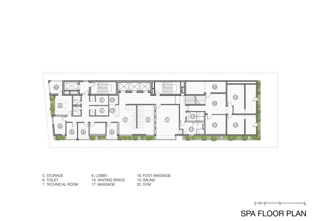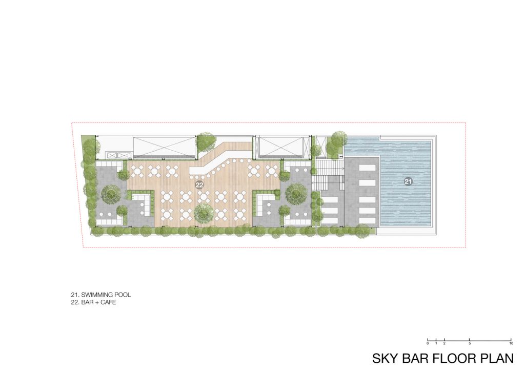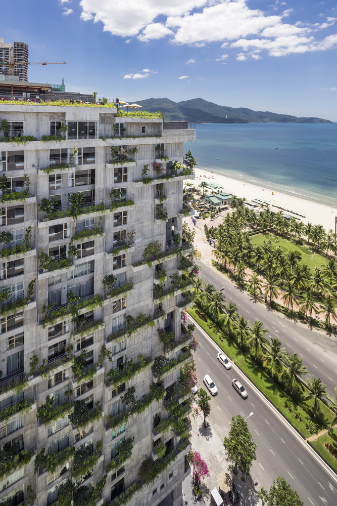 Khách sạn có tổng diện tích sàn 11.895m2, có 153 phòng từ tiêu chuẩn đến căn hộ cao 21 tầng với các tiện ích tiêu chuẩn như tầng hầm để xe, tầng hầm kỹ thuật & dịch vụ, khu vực sảnh, coffee house, spa và sky bar. Nhờ mặt tiền nhiều cây xanh nên tất cả các phòng đều có tầm nhìn đẹp dù hướng biển hay giáp đất. Ngoài tính thẩm mỹ cao, hệ thống cây xanh còn tạo vi khí hậu cho công trình và giúp không gian nội thất mát mẻ hơn. Các loại cây được sử dụng trong dự án là các loại cây nhiệt đới, phù hợp với khí hậu vùng biển như: địa lan lai, lan hồ điệp, hoa bách hợp, hoa giấy, thông dương … vv.