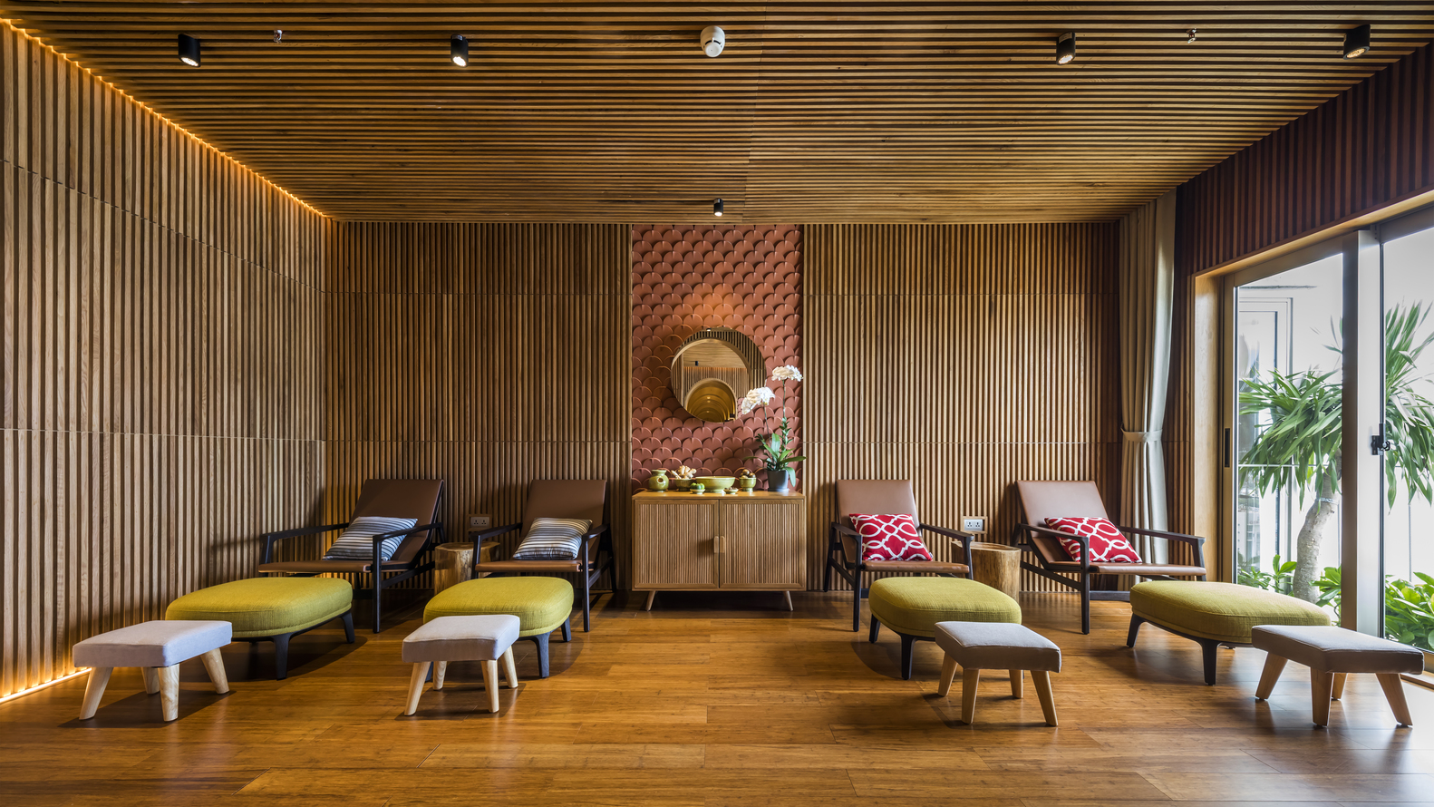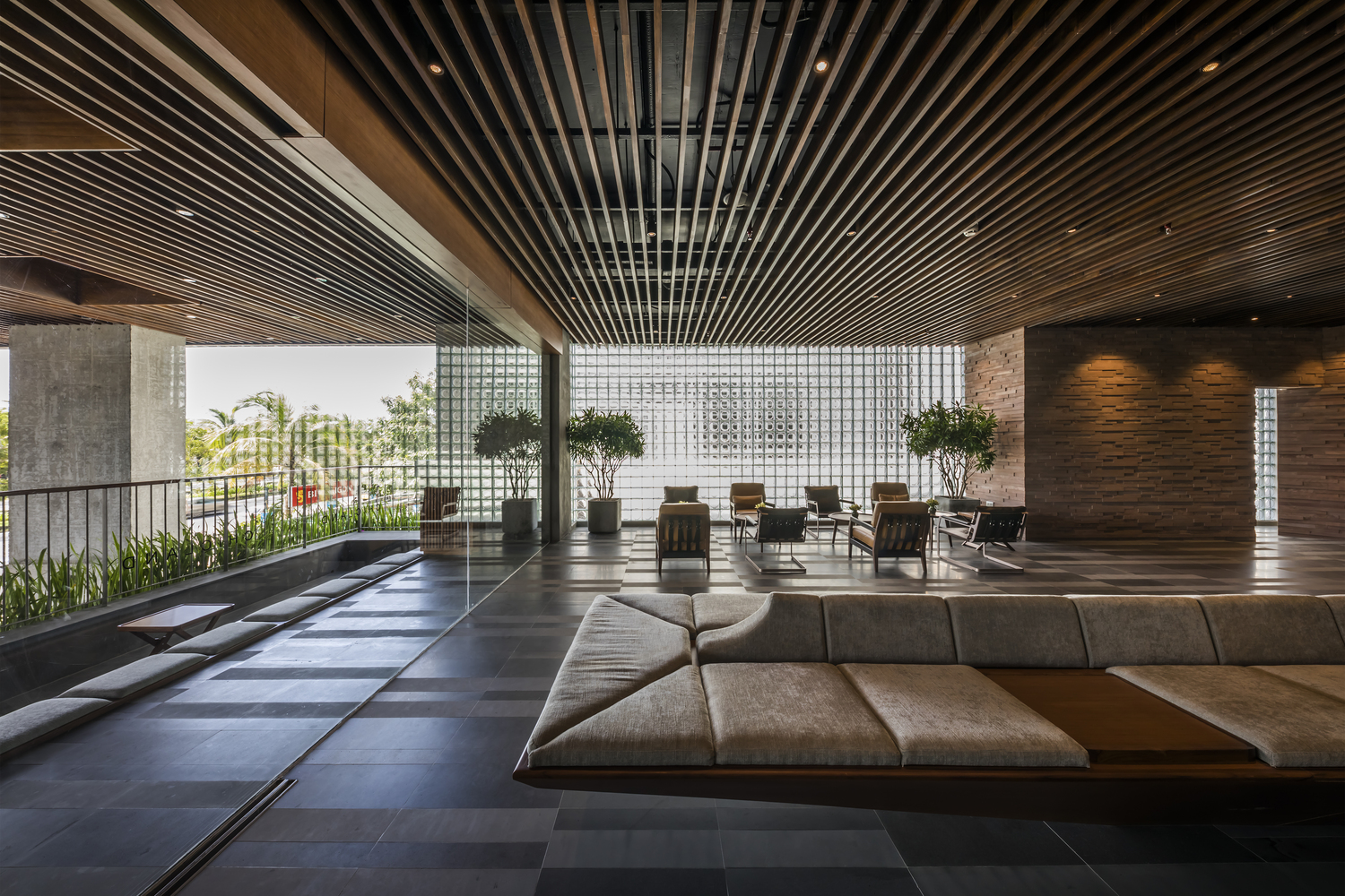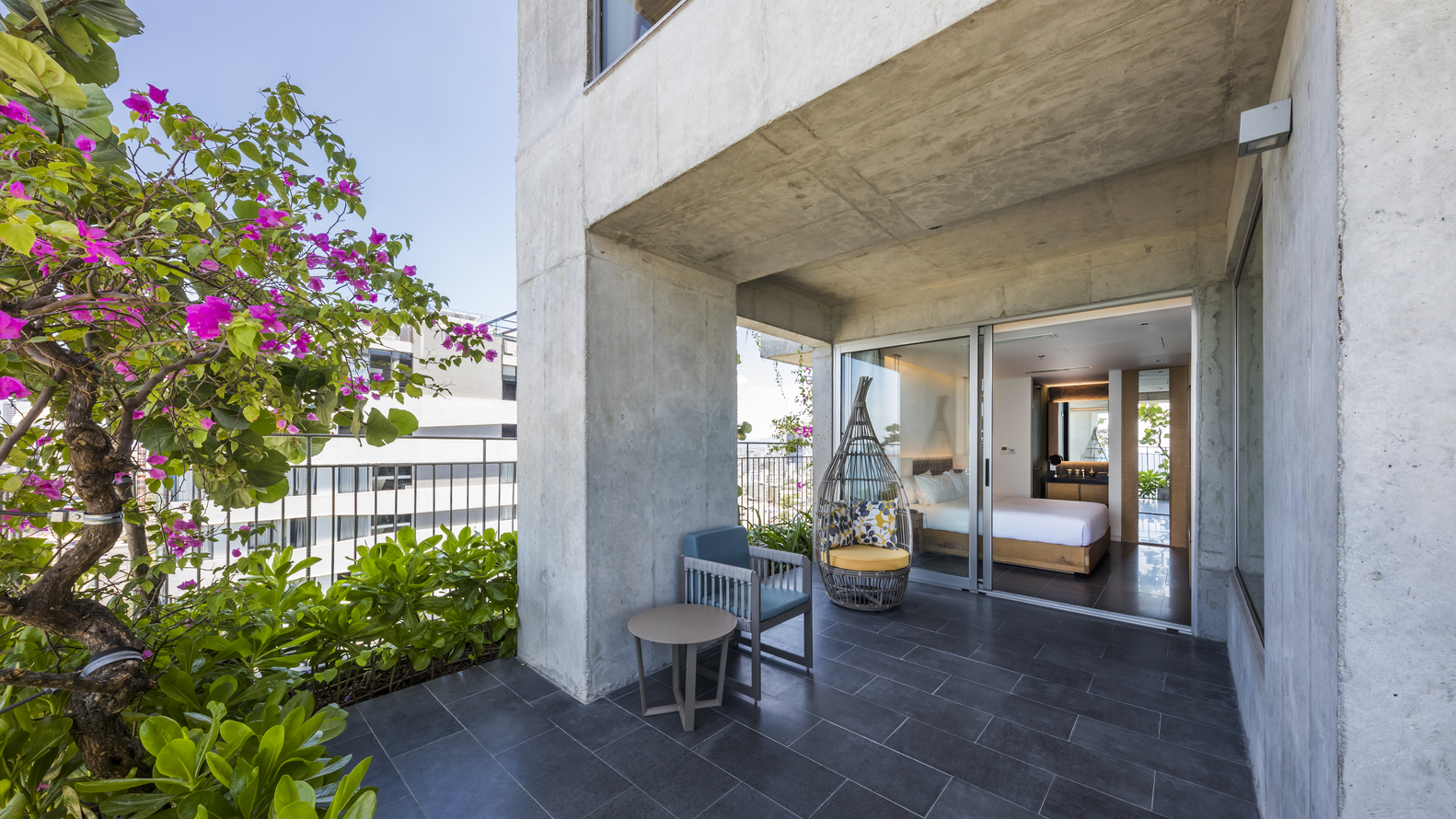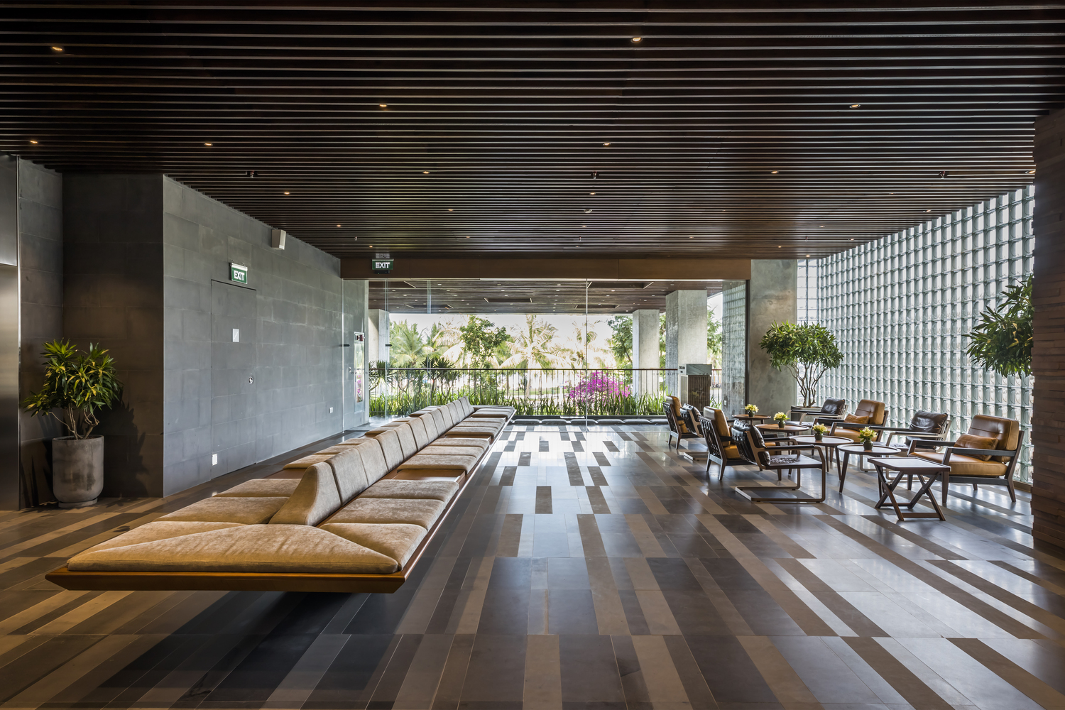 Tường được làm bằng vật liệu chính là bê tông và được bao phủ bởi hệ thống cây xanh nhiệt đới. Mặt tiền xanh tạo cảm hứng cho thiết kế nội thất. Nội thất và vật liệu trang trí nội thất được làm từ vật liệu địa phương hoặc tự nhiên: gỗ, đá, tre, nứa, mây … Phòng khách được thiết kế với phòng vệ sinh mở liên thông với phòng ngủ. Tất cả các phòng nghỉ đều sử dụng tối đa hệ thống cửa kính để lấy sáng tự nhiên, tầm nhìn và hưởng lợi từ cây xanh mặt tiền.