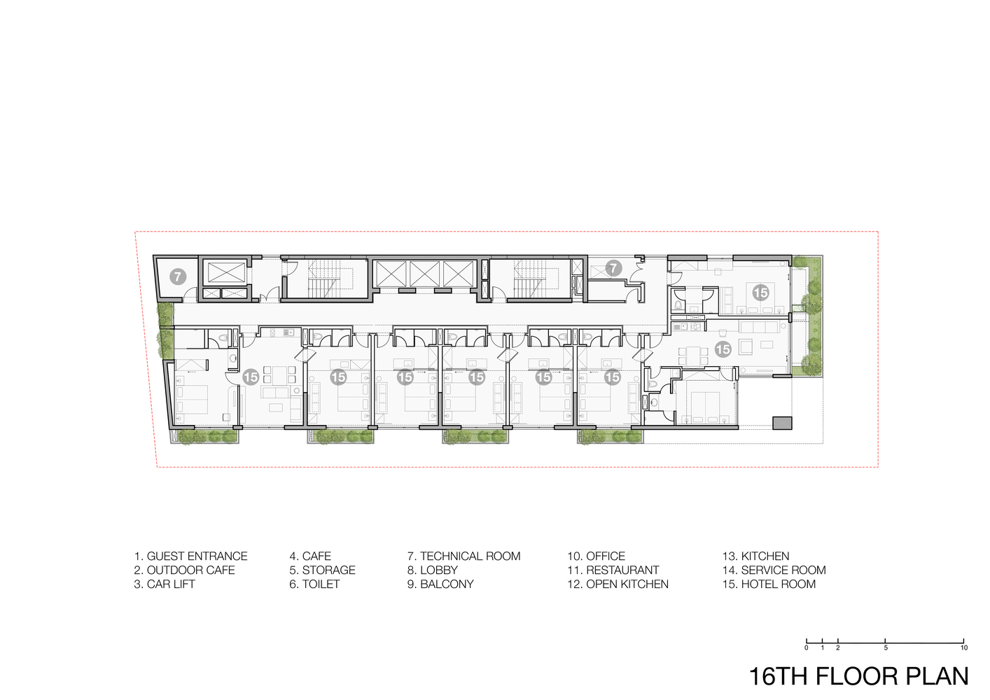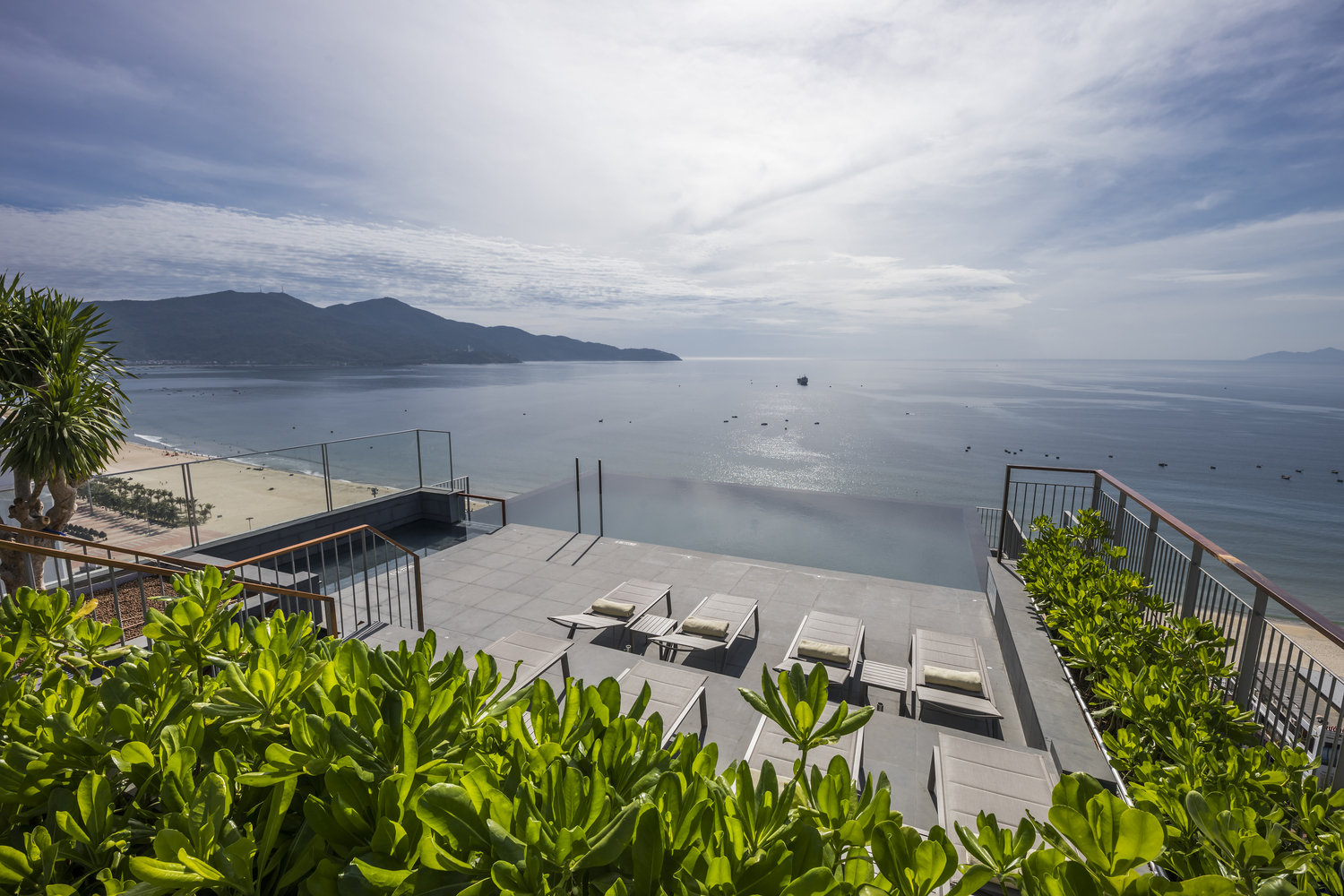 Khách sạn có tổng diện tích sàn 11.895m2, có 153 phòng từ tiêu chuẩn đến căn hộ cao 21 tầng với các tiện ích tiêu chuẩn như tầng hầm để xe, tầng hầm kỹ thuật & dịch vụ, khu vực sảnh, coffee house, spa và sky bar. Nhờ mặt tiền nhiều cây xanh nên tất cả các phòng đều có tầm nhìn đẹp dù hướng biển hay giáp đất. Ngoài tính thẩm mỹ cao, hệ thống cây xanh còn tạo vi khí hậu cho công trình và giúp không gian nội thất mát mẻ hơn. Các loại cây được sử dụng trong dự án là các loại cây nhiệt đới, phù hợp với khí hậu vùng biển như: địa lan lai, lan hồ điệp, hoa bách hợp, hoa giấy, thông dương … vv.