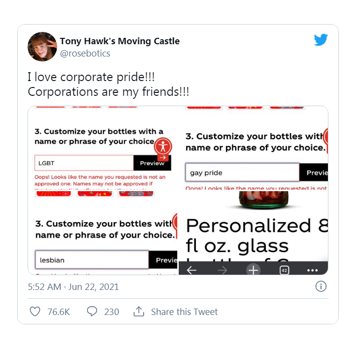 Năm nay, Coca-Cola đã đưa ra ý tưởng về nhãn hiệu cầu vồng được cá nhân hóa, cho phép khách hàng có thể tùy chỉnh tên của họ trên chai Coca-Cola phiên bản đặc biệt này.