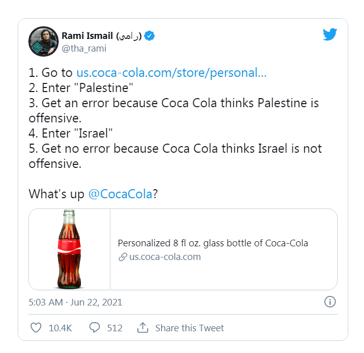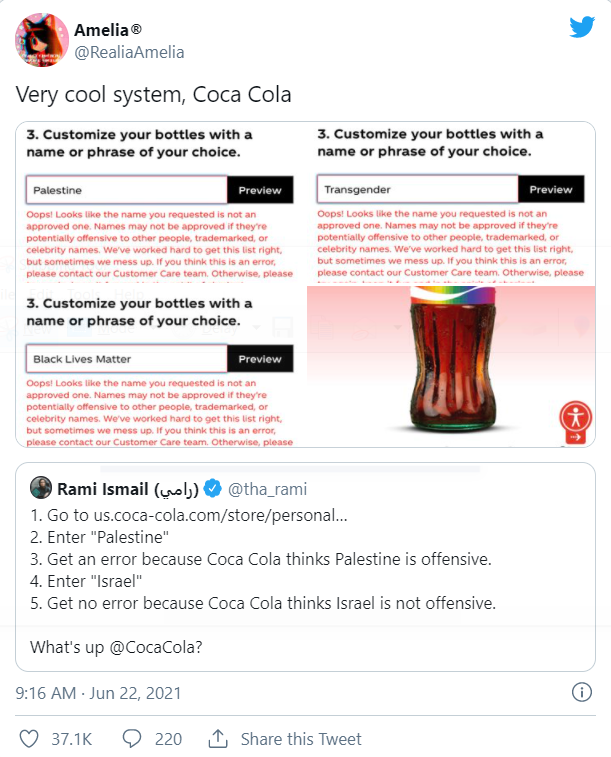 Nếu bạn cho rằng đây là lỗi, vui lòng liên hệ với nhóm Chăm sóc khách hàng của chúng tôi. Còn không thì các bạn hãy thử lại, vui vẻ và trên tinh thần chia sẻ nhé! ” Mặc dù Coca-Cola tuyên bố họ đã “làm việc rất chăm chỉ để đưa danh sách này đúng vào danh sách này”, nhưng vẫn chưa rõ lý do tại sao một số điều khoản bị cấm trong khi những điều khoản khác thì không. Ví dụ: trong khi “Palestine” không được phép, “Israel” được bật đèn xanh và “White Lives Matter” cũng như “Nazis” thì đều được, nhưng “Black Lives Matter” bị cấm.