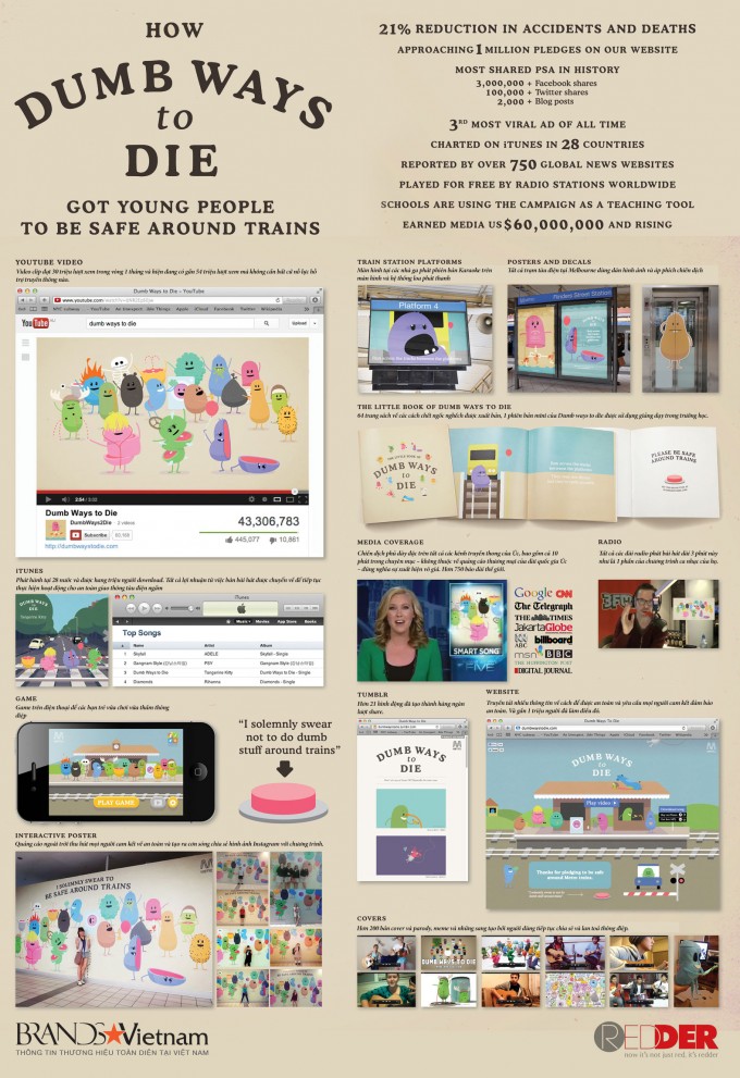 Biến cái người nghe phải biết thành cái người nghe muốn biết, đó là mấu chốt của truyền tải thông điệp thành công. Xuất hiện từ tháng 11/2012 trên Youtube, cho đến nay video “Dumb ways to die” đã thu hút gần 54 triệu view và chiến dịch marketing đã phá kỉ lục tại Cannes Lions và Asian Marketing Effectiveness 2013, giành được số giải thưởng kỉ lục cho 1 chiến dịch quảng cáo.