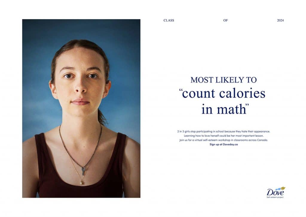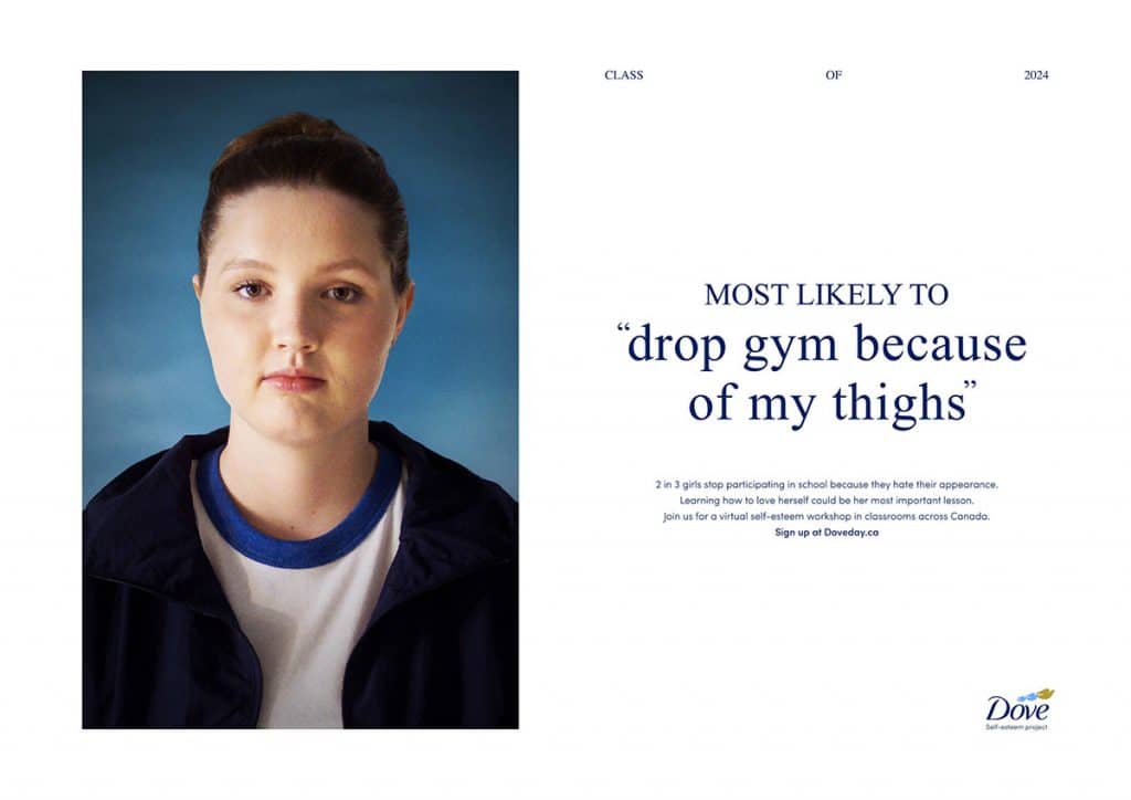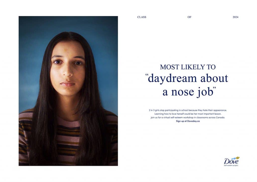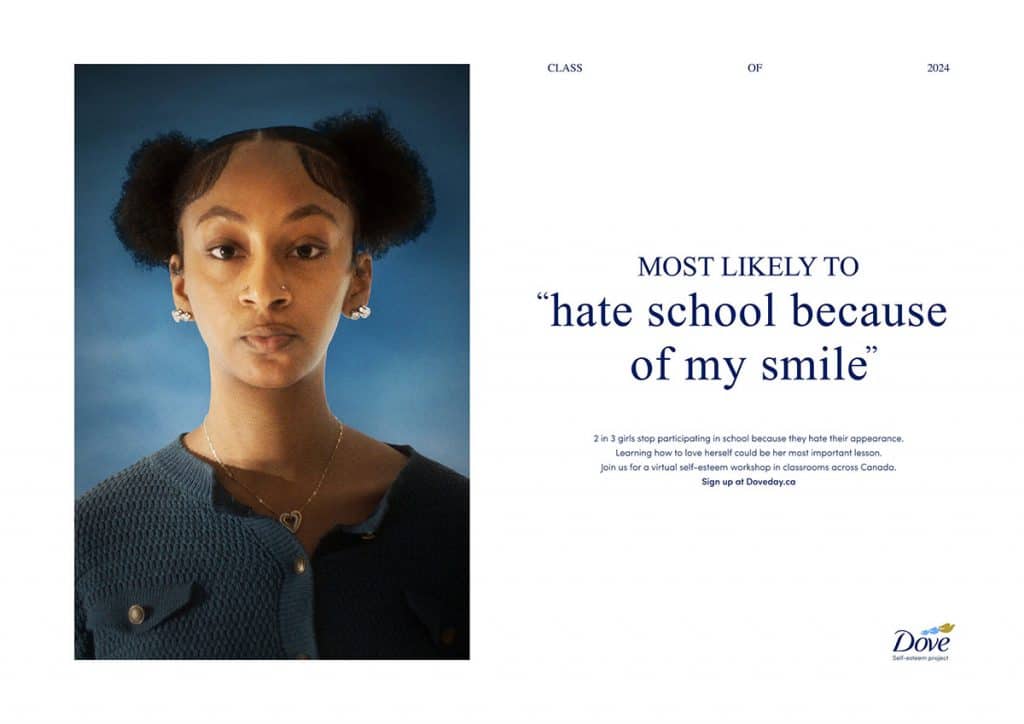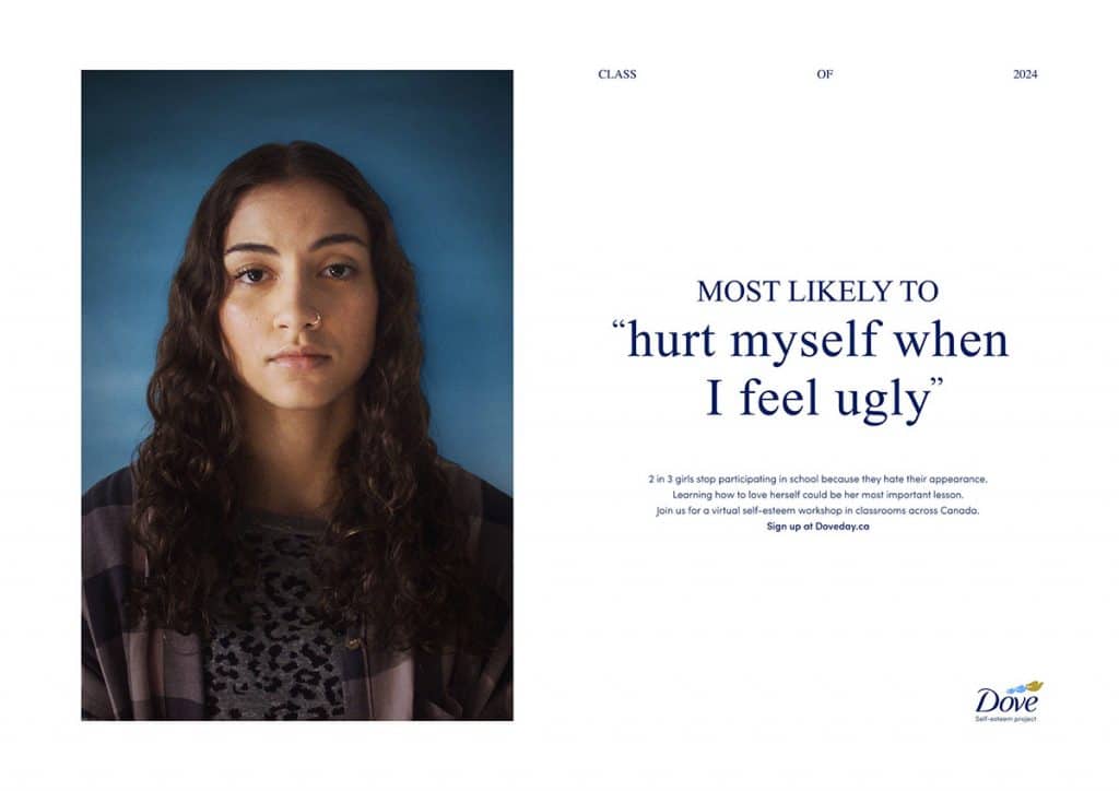 Thương hiệu Dove Canada ra mắt chiến dịch quảng cáo ‘Most Likely To’ nhằm giải quyết những vấn đề liên quan đến sự tự ti về ngoại hình và tình trạng thiếu tự tin của học sinh trung học.