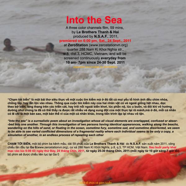 Vào lúc 18 giờ ngày 24.9, Trung tâm nghệ thuật Ga 0 của nghệ sĩ Nguyễn Như Huy sẽ trình chiếu bộ phim ba kênh màu (là thể loại kết hợp giữa video art và film – một bộ phim được kể trong 3 không gian khác nhau, được chiếu bởi ba màn hình) Chạm tới biển (Into the sea) của cặp nghệ sĩ song sinh Lê Ngọc Thanh và Lê Đức Hải (Le Brothers) tại 288 Nam Kỳ Khởi Nghĩa, P.8, Q.3, TP.HCM.