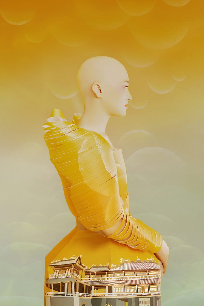 “Hoàng” là bức ảnh mình chụp bạn mẫu của mình bên thiết kế chiếc áo giấy của chị Tú Bông đã xử lý trong vòng nửa ngày được in vào đó là tác phẩm của Todd Huỳnh! Cả bọn đã có một khoảng thời gian cũng nhau cực kỳ xứng đáng luôn. Ở tác phẩm này, Chiron chọn kiểu chụp tách lớp, tụi mình chụp riêng bạn mẫu, riêng phần quần áo và làm hậu kỳ lên bản in tranh của Todd.