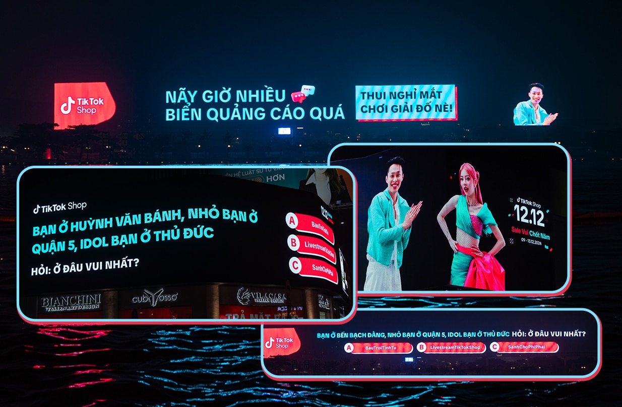 “Phủ sóng” khắp 2 thành phố lớn nhất nhì Việt Nam, chiến dịch OOH “Sale Vui Chốt Năm 12.12” xuất hiện hoành tráng tại các vị trí trung tâm nổi bật ở Hà Nội và Thành phố Hồ Chí Minh, đặc biệt là trên Sky LED Thủ Thiêm – màn hình quảng cáo lớn nhất Đông Nam Á. Những câu hỏi ngắn đầy tính giải trí của TikTok Shop không chỉ khơi gợi sự tò mò của mọi người mà còn làm xua tan đi những giây phút kẹt xe khó chịu. Bên cạnh đó, hình ảnh HURRYKNG đi cùng chiến dịch càng làm tăng thêm sức hút và độ nhận diện cho thương hiệu.