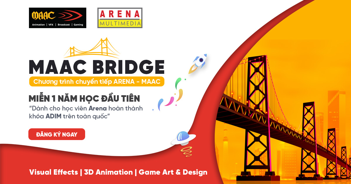 Tiếp sức để đáp ứng nhu cầu này, MAAC Global đã đem đến một chương trình cực kỳ thú vị mang tên là MAAC BRIDGE – Chương trình học chuyển tiếp ARENA – MAAC dành riêng cho học viên Arena trên toàn quốc. Với chương trình này, các bạn đã có bằng ADIM tại Arena sẽ được MIỄN HỌC NĂM ĐẦU TIÊN tại MAAC với các khóa học Thiết kế Game (Game Art & Design), VFX (Kỹ xảo điện ảnh) và 3D Animation (Hoạt hình 3D).