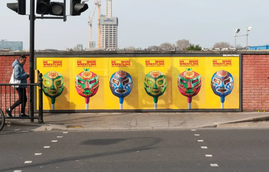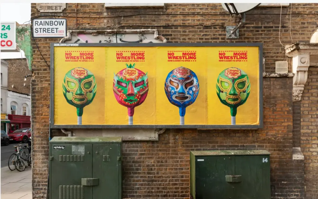 Sau khi gây tò mò với vỏ kẹo không thể mở, Chupa Chups chính thức ra mắt thiết kế bao bì “dễ mở hơn”. Để quảng bá cho packaging mới này, agency BBH London đã triển khai chiến dịch OOH mang tên “No More Wrestling” (tạm dịch: Không còn phải vật lộn nữa). Thay vì phóng đại một cải tiến bao bì vốn khá “nhạt”, chiến dịch lại chọn cách khai thác chính sự vật lộn quen thuộc mà ai cũng từng trải qua.