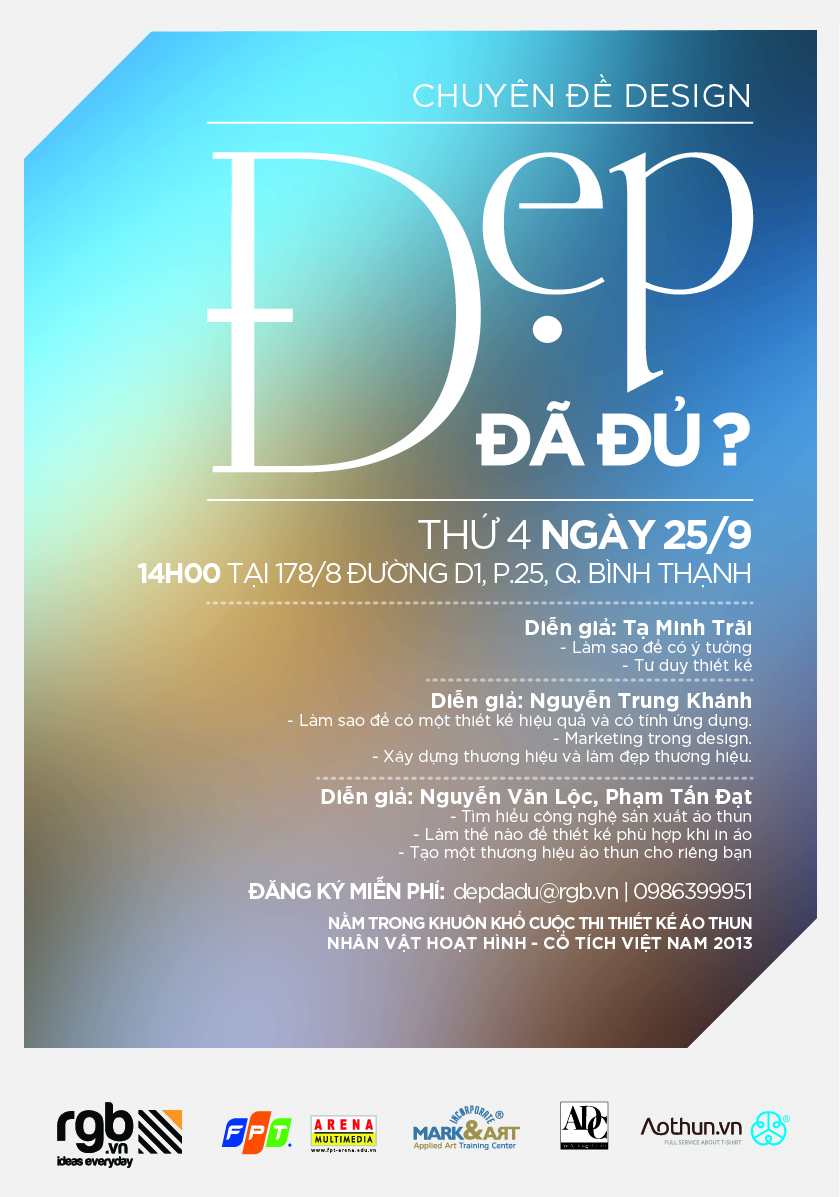 Nằm trong khuôn khổ cuộc thi Thiết kế áo thun Nhân vật hoạt hình – Cổ tích Việt Nam 2013, RGB.vn phối hợp cùng FPT Arena, Mark&Art, ADC và Aothun.vn tổ chức chuyên đề dành cho các bạn quan tâm với một chủ đề cũng rất hot: Đẹp Đã Đủ? Hãy tham gia để được gặp gỡ những chuyên gia, khách mời nhiều kinh nghiệm không những trong lĩnh vực design mà còn chuyên về thương hiệu, marketing. Chắc chắn bạn sẽ có cái nhìn đa chiều hơn về nghề thiết kế, cách làm sao để thiết kế thật sự trở nên hiệu quả. Và tất nhiên, bạn sẽ biết cách để làm những thiết kế của mình đạt chất lượng cao cùng cơ hội tạo nên thương hiệu áo thun cho riêng mình.