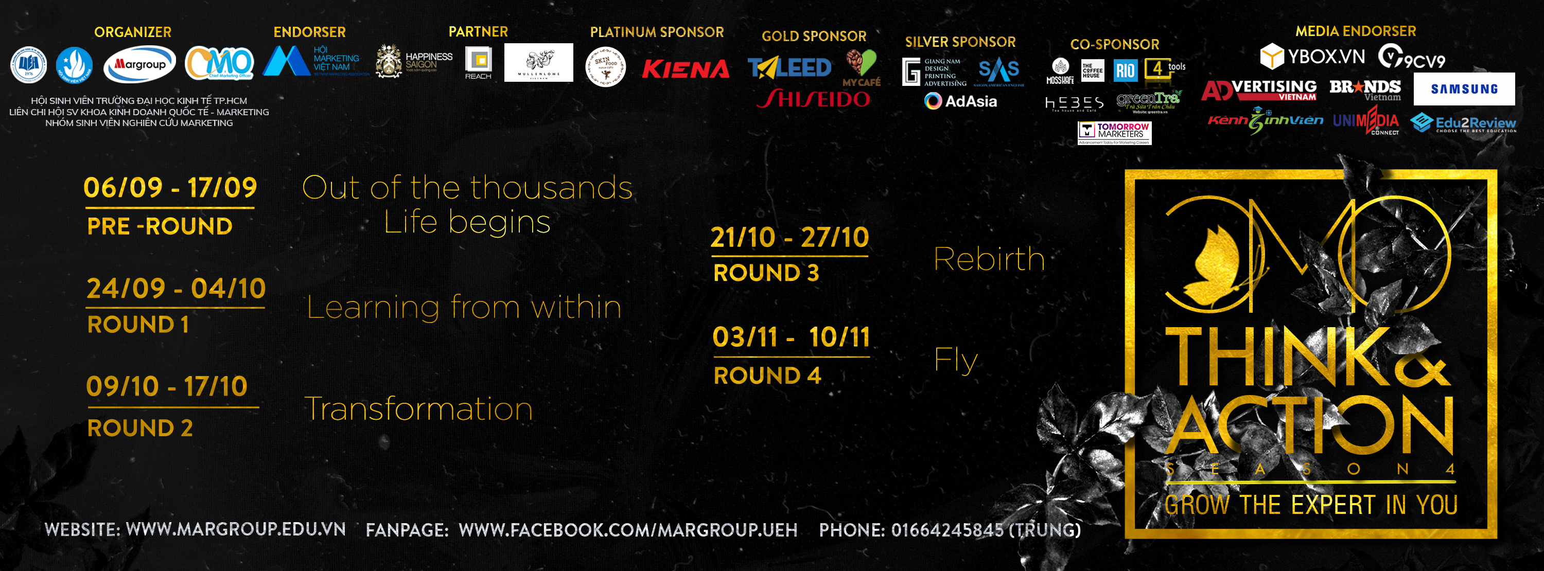 Góp phần tạo ra sân chơi uy tín, chuyên nghiệp cho sinh viên yêu thích Marketing trên toàn thành, đồng hành xuyên suốt cuộc thi CMO THINK & ACTION 2017 là Hiệp hội Marketing Việt Nam với vai trò nhà bảo trợ và sự đồng hành của các đối tác như MullenLowe Việt Nam, REACH Communications và Happiness SaiGon. Hứa hẹn sẽ mang lại nhiều điều thú vị và bất ngờ.
