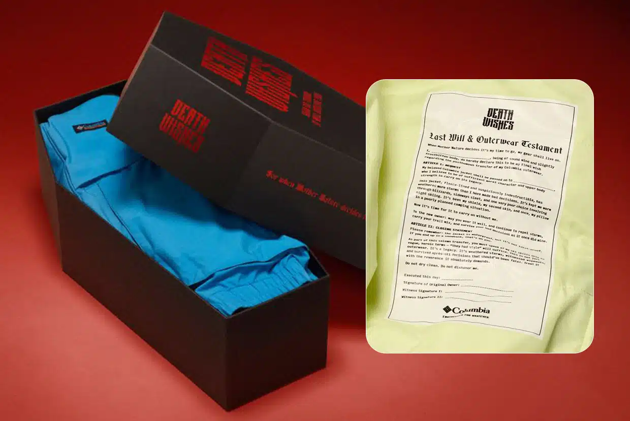 Trong chiến dịch mới táo bạo mang tên “Engineered for Whatever” (Sinh ra để đối đầu với mọi thứ), Columbia Sportswear đã đưa khái niệm “độ bền sản phẩm” lên đến mức cực đoan, bằng cách khâu hẳn một bản “Last Will & Outerwear Testament” (Di chúc và Di sản Áo khoác) vào một số mẫu áo giới hạn.