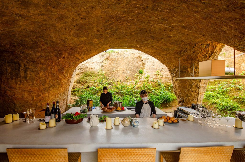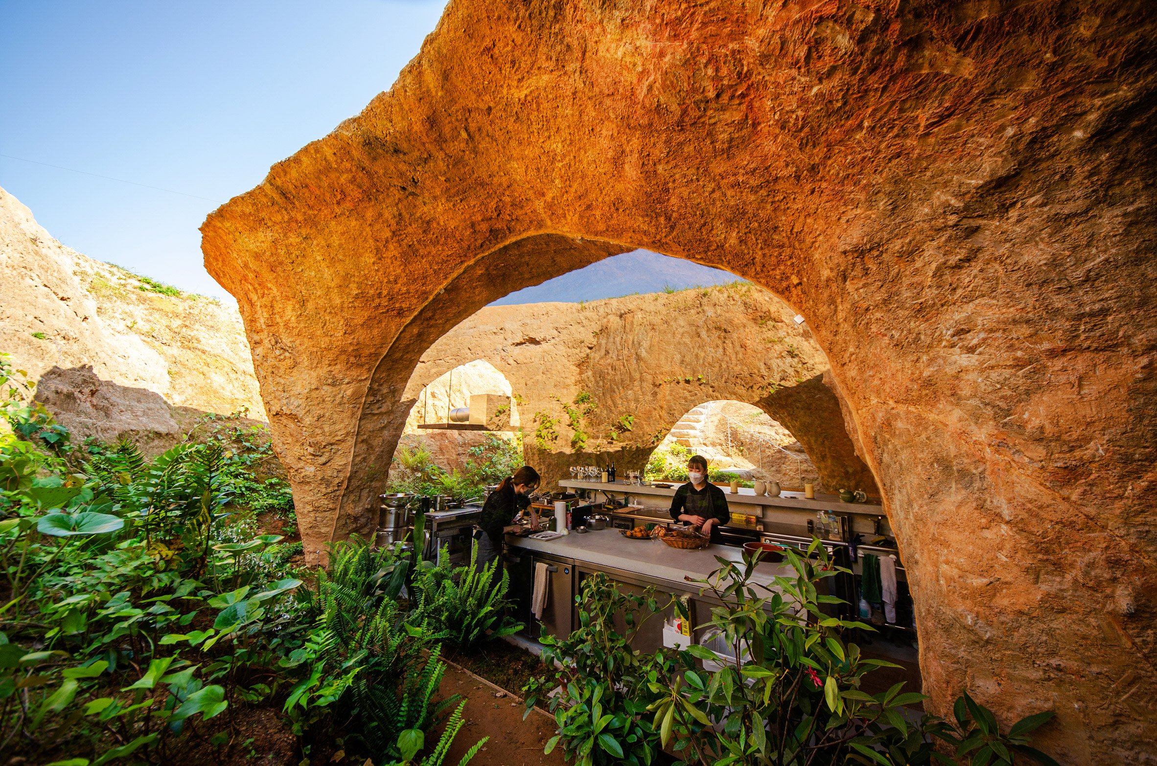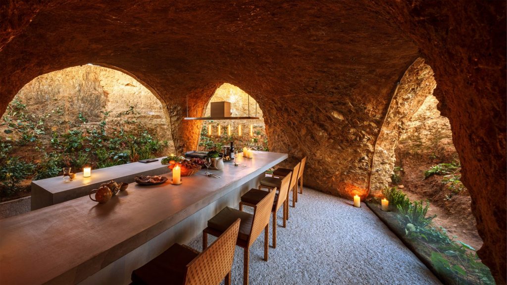 Trong nhà hàng, một hòn đảo bê tông dài tạo thành trung tâm nơi thực khách có thể ngồi trên ghế quầy bar trong khi đầu bếp chuẩn bị bữa ăn ở phía bên kia.