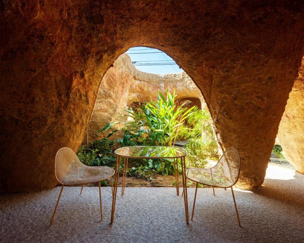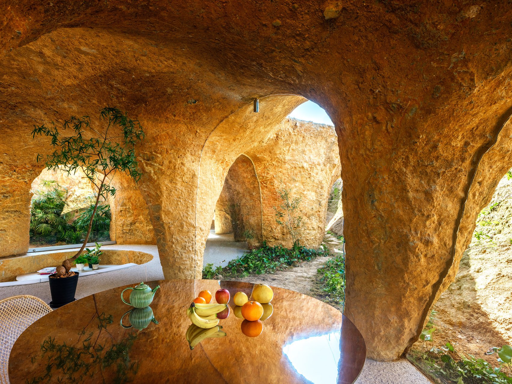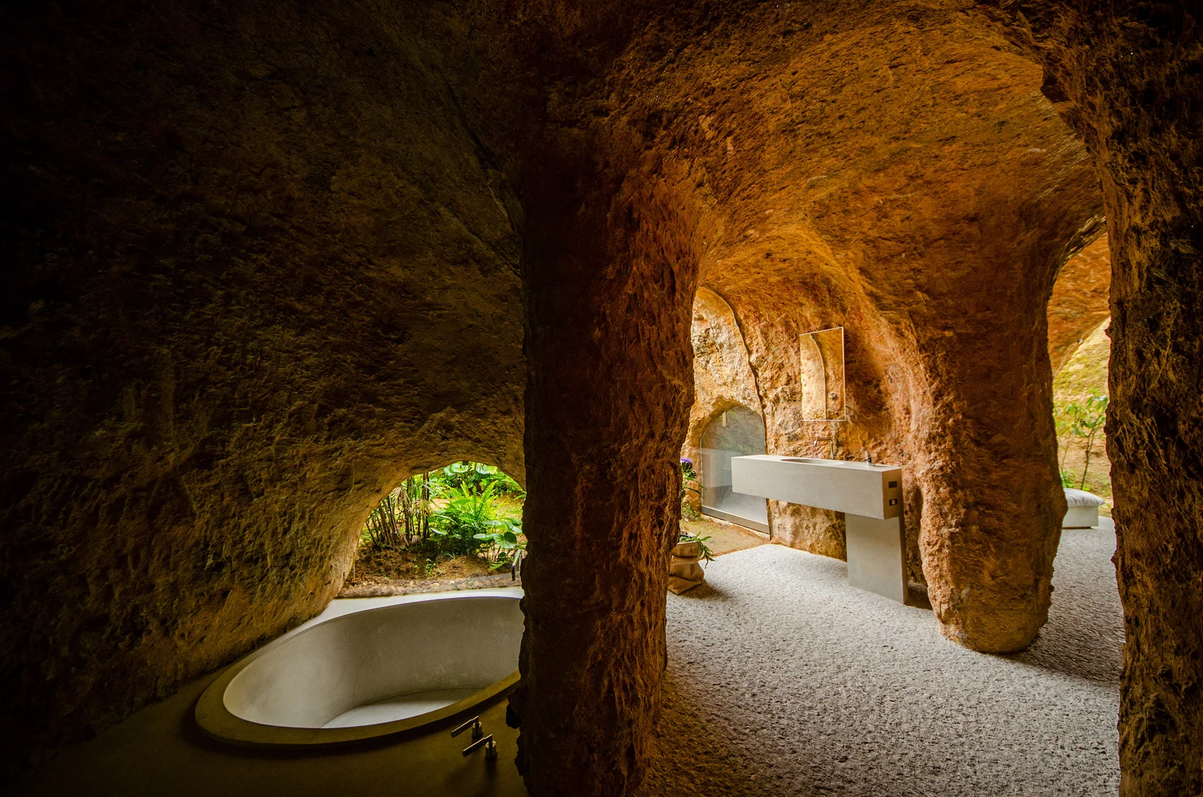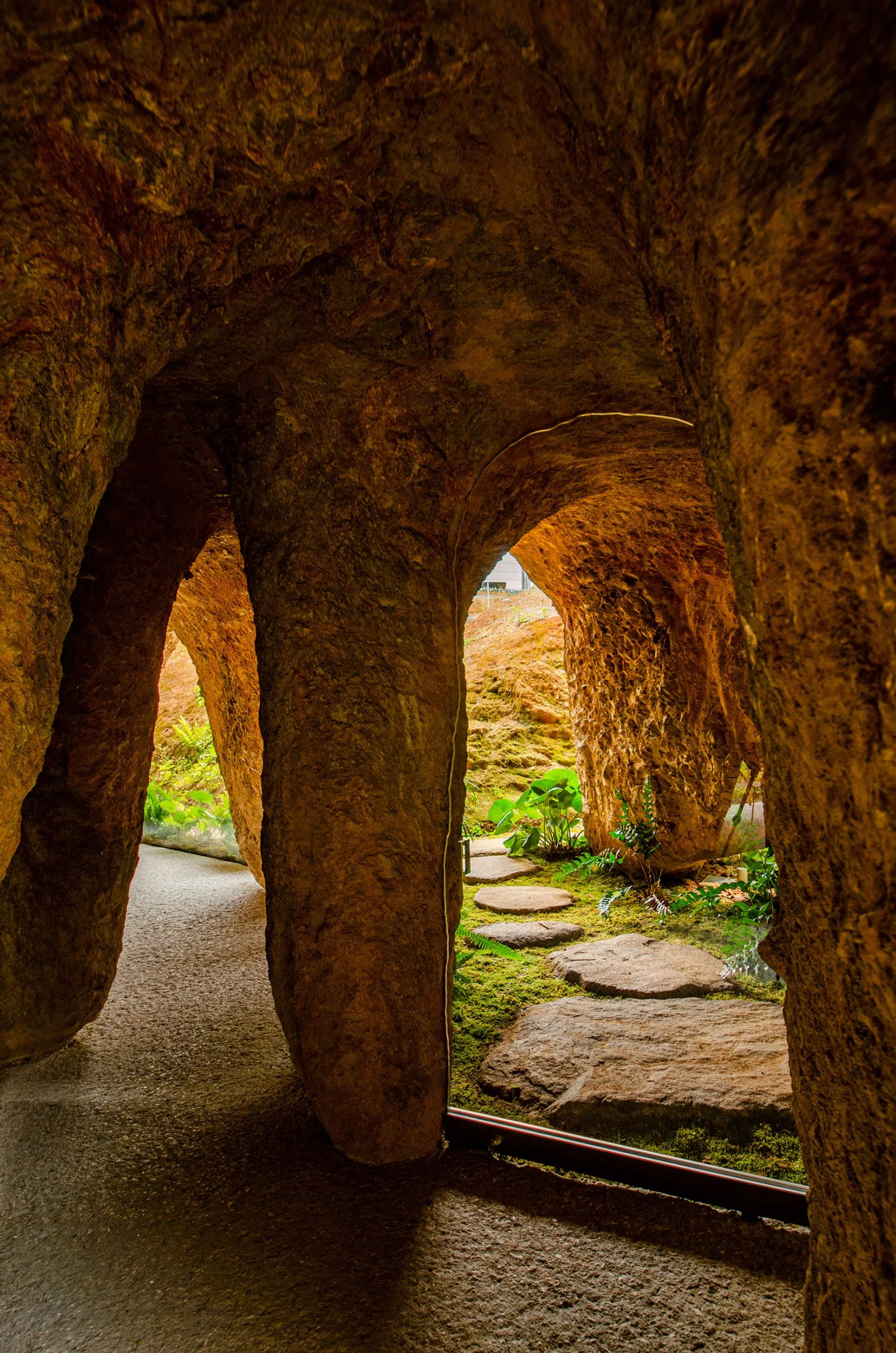 Cấu trúc bao gồm một mê cung các không gian hang động được ngăn cách bởi các lỗ hở hình vòm và các cột giống như thạch nhũ, tất cả đều được làm từ bê tông phủ đầy bùn.