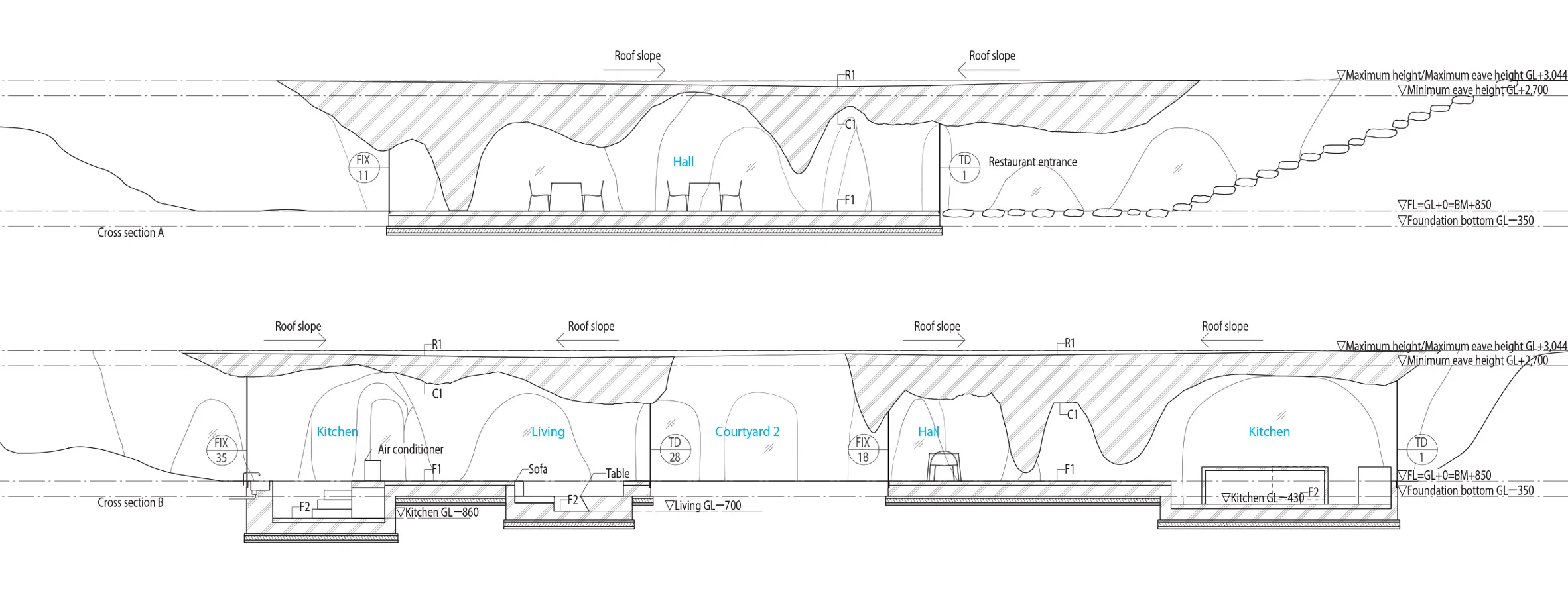 Những khu vực tráng men này giúp phân chia ranh giới giữa các không gian bên trong một cách tinh tế cùng ba cái sân ngăn cách nhà hàng với ngôi nhà.
