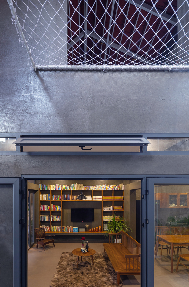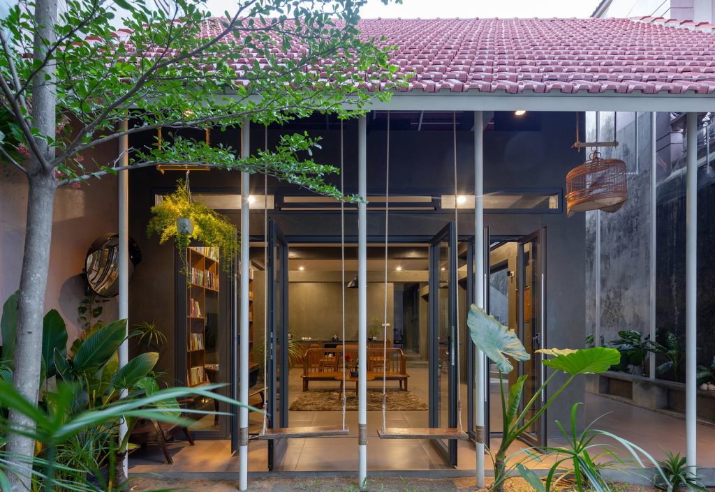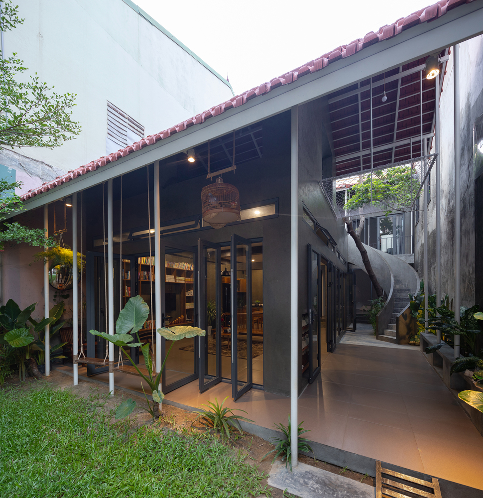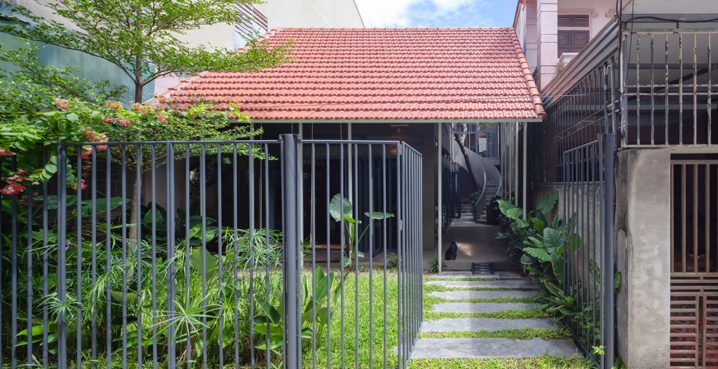 Việc sử dụng hệ thống mái ngói đỏ truyền thống, dốc 2 chiều vừa tạo bẫy gió vừa giúp tầm nhìn không gian trở nên đa dạng hơn. Độ phủ của mái tạo ra những khoảng đệm chuyển tiếp giữa bên trong và bên ngoài, sân trước – sân trong – sân mái. Đồng thời, hệ thống mái ngói còn làm tăng tính bền vững cho công trình trước tác động của khí hậu khắc nghiệt của miền Trung.