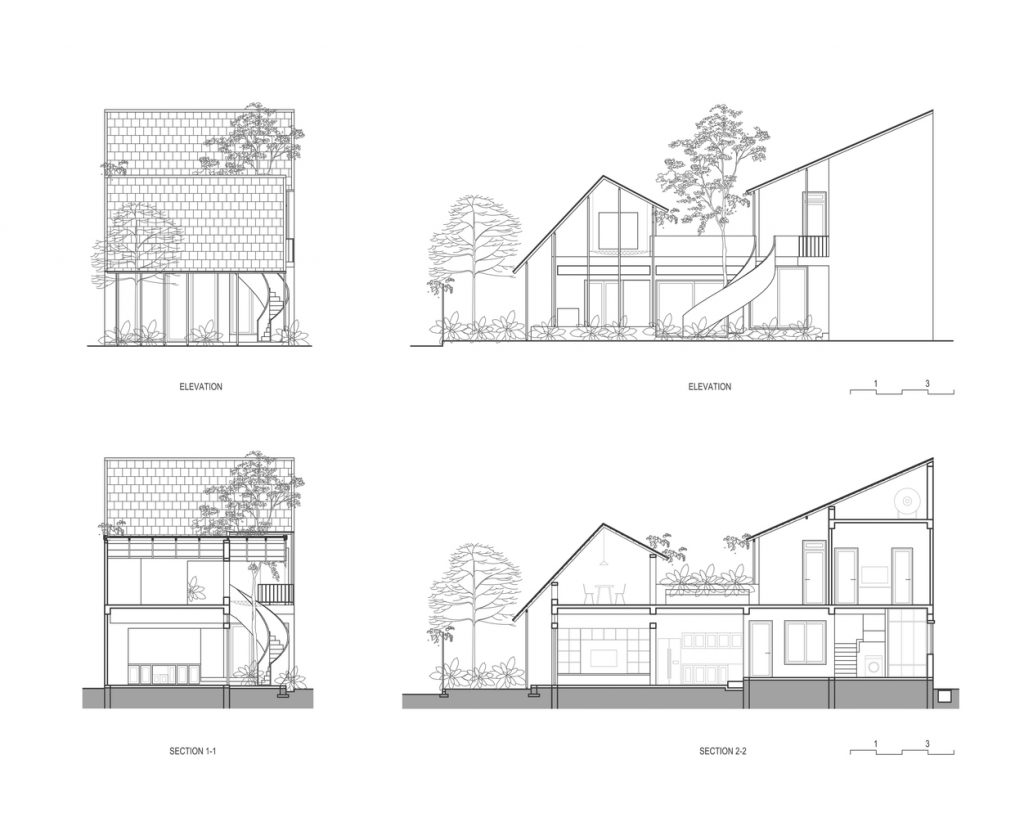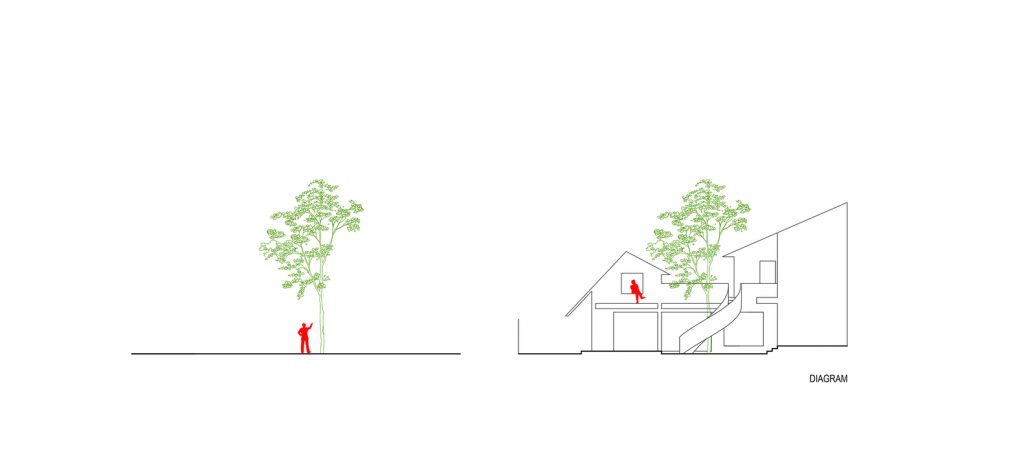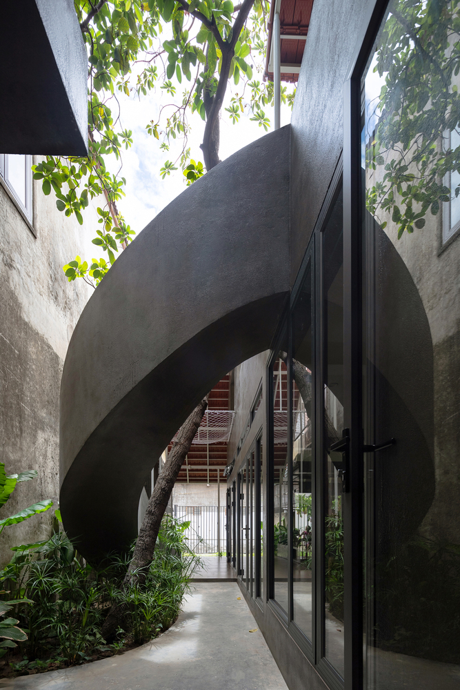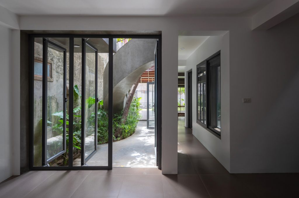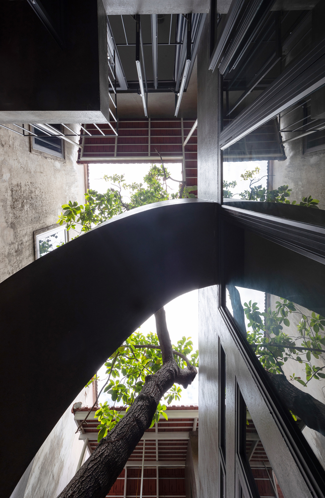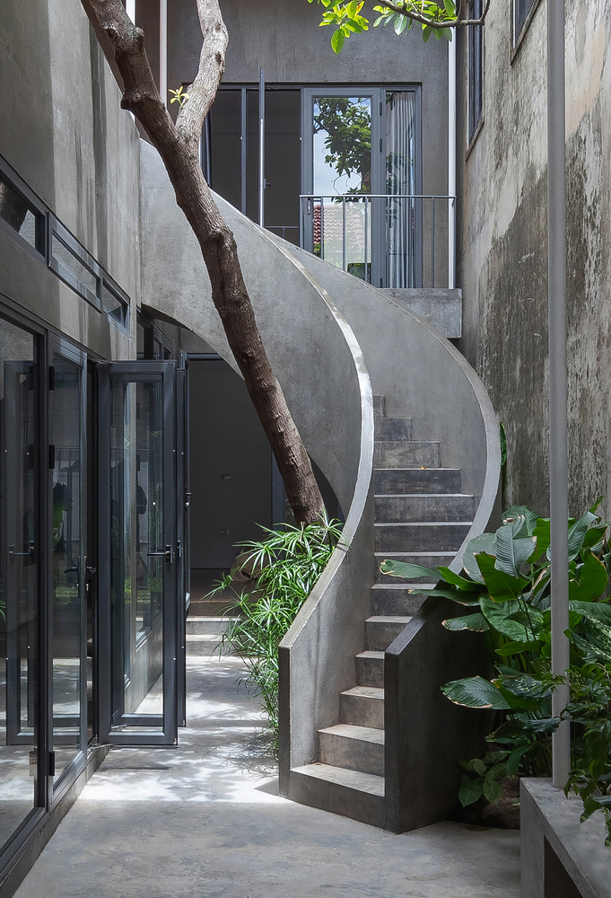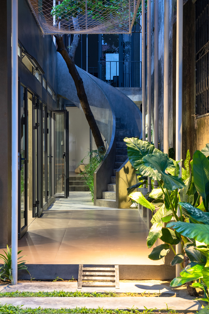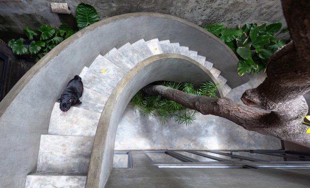 Trong quá trình khảo sát địa điểm hiện có, KTS đã cố gắng thuyết phục chủ sở hữu giữ một cây xanh lớn bên trong khuôn viên. Vì nó là linh hồn của ngôi nhà – những thứ thuộc về thiên nhiên. Giờ đây, cái cây này trở thành điểm nhấn của khu vườn nhỏ trong sân, với cầu thang xoắn ốc ôm lấy cây, kết nối không gian giữa sân trên và sân dưới của ngôi nhà.