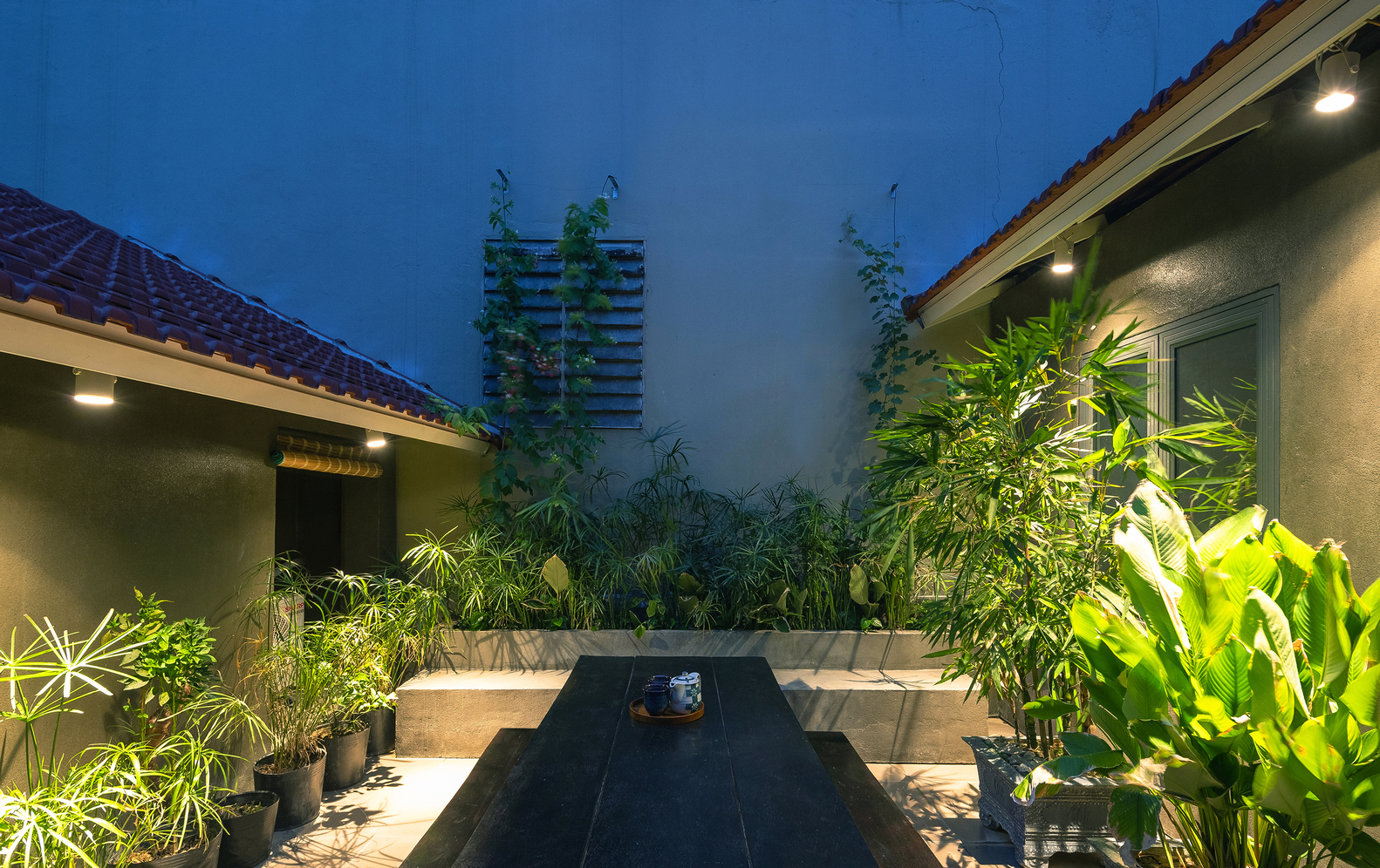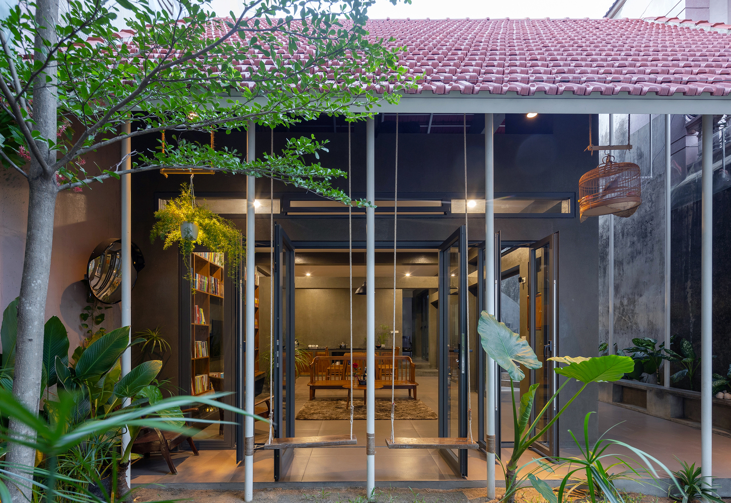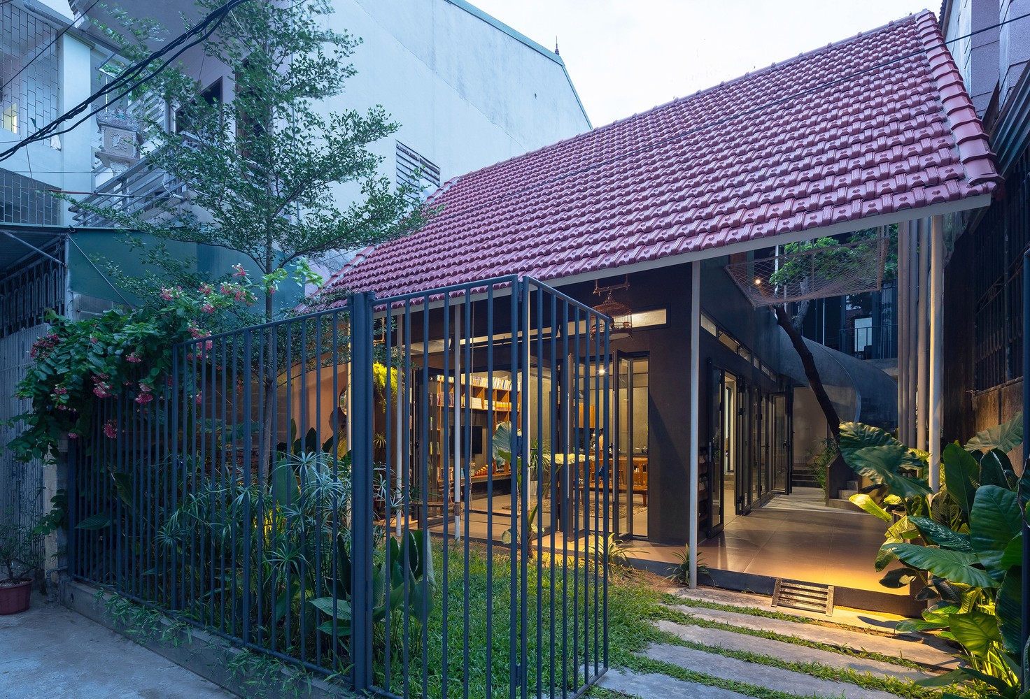 Việc sử dụng hệ thống mái ngói đỏ truyền thống, dốc 2 chiều vừa tạo bẫy gió vừa giúp tầm nhìn không gian trở nên đa dạng hơn. Độ phủ của mái tạo ra những khoảng đệm chuyển tiếp giữa bên trong và bên ngoài, sân trước – sân trong – sân mái. Đồng thời, hệ thống mái ngói còn làm tăng tính bền vững cho công trình trước tác động của khí hậu khắc nghiệt của miền Trung.