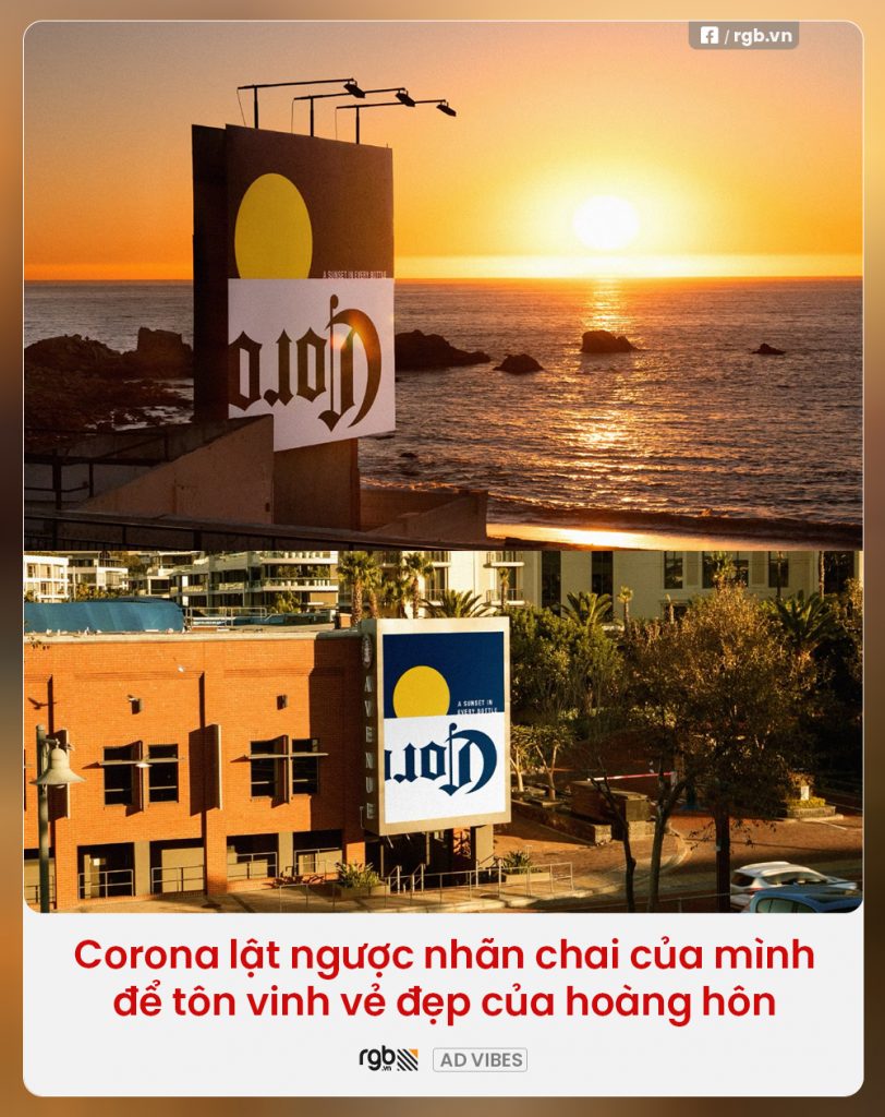Tận dụng chi tiết đồ họa tinh tế này, Corona đã hợp tác cùng agency JKR biến nó thành trung tâm của một chiến dịch toàn cầu. Các bảng quảng cáo với nhãn chai Corona lật ngược được đặt tại những địa điểm ngắm hoàng hôn đẹp nhất ở Nam Phi, Chile và Canada, và đặc biệt các phiên bản digital được lập trình để phát sáng đúng thời điểm mặt trời lặn, tạo nên một khoảnh khắc quảng cáo sống động và đầy cảm xúc.