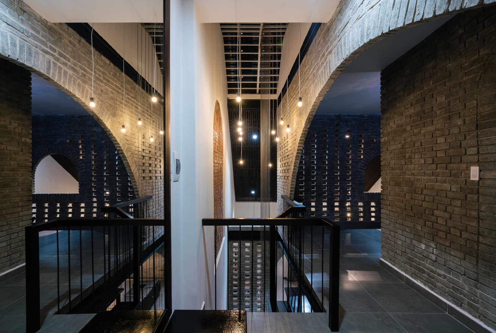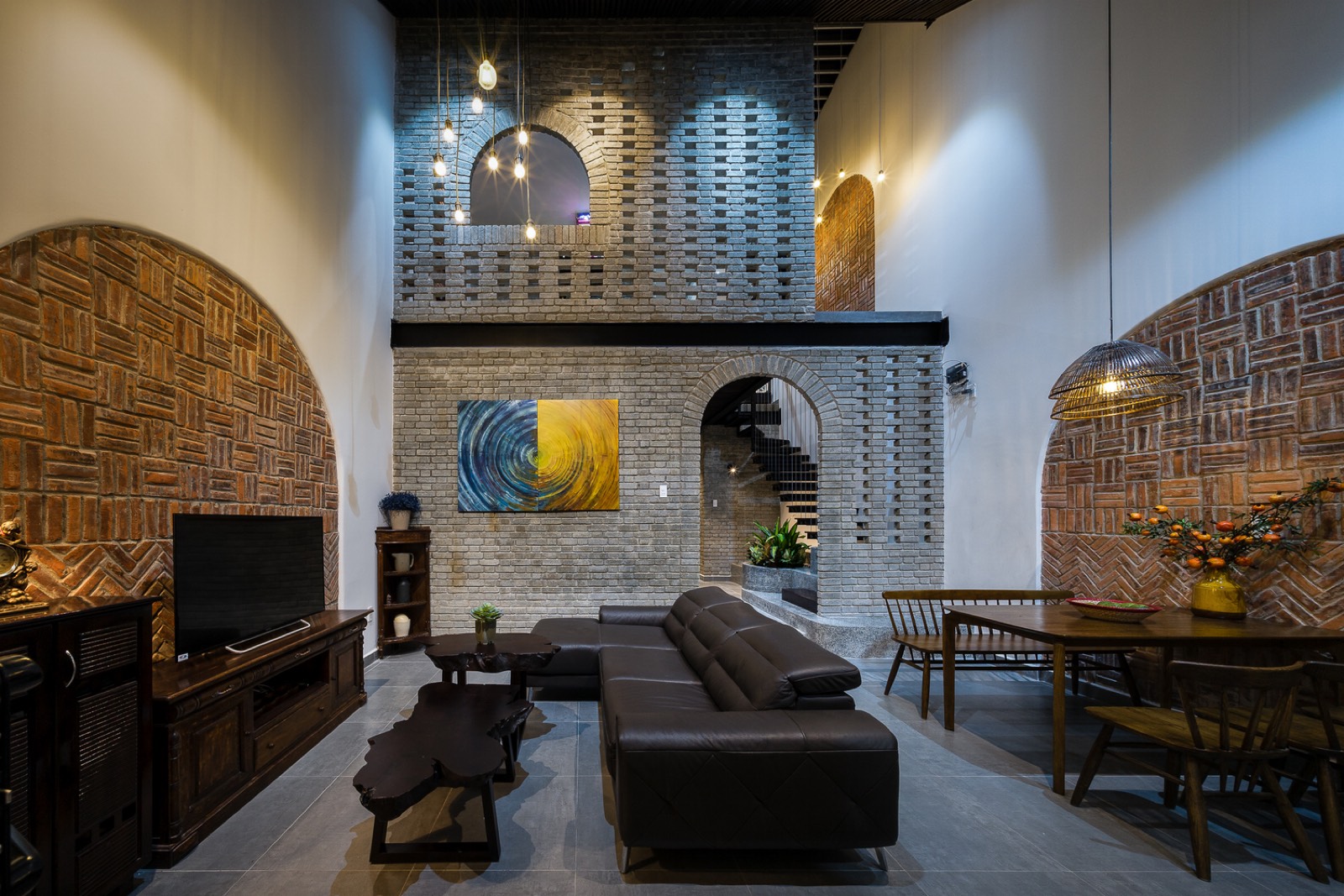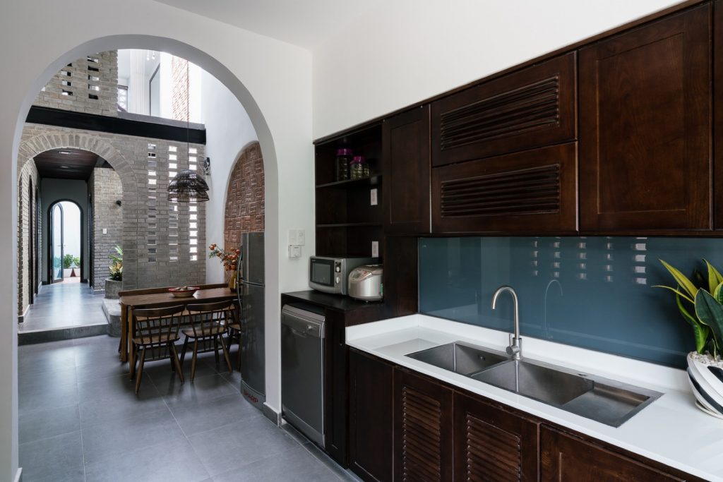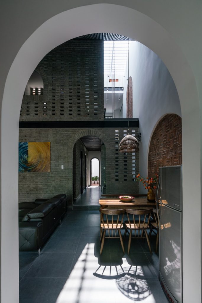 Tường gạch đỏ xây thô kiểu cách giống một cánh cổng, mà mỗi khi gia đình hội họp sẽ như trở về với quê hương. Cánh cổng vòm cong tại khu vực bàn ăn là điểm nhấn cho khung cảnh gia đình sum vầy bên mâm cơm và trò chuyện vui vẻ.