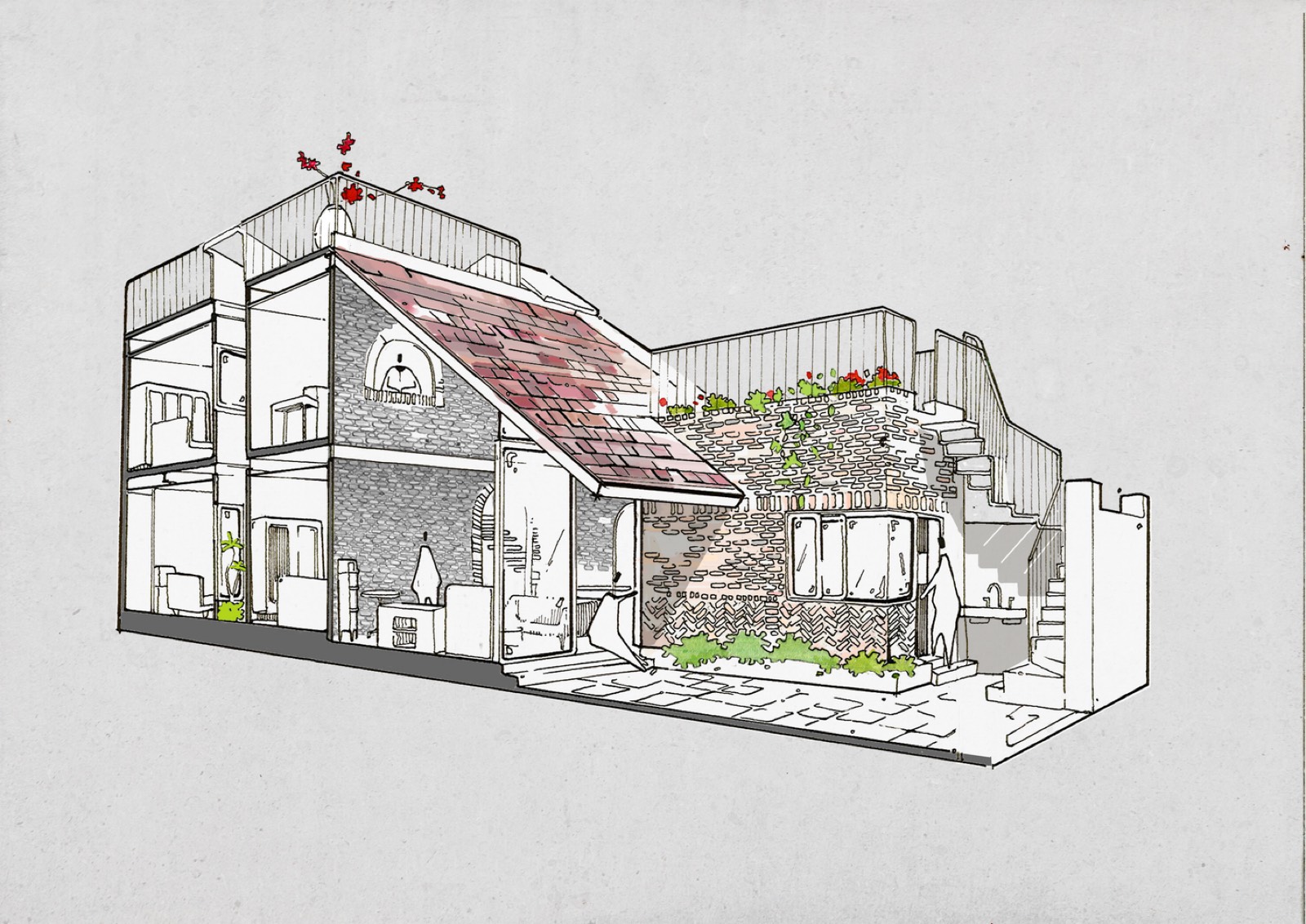 KTS sử dụng vật liệu chính là gạch trần và gỗ tự nhiên. Hình dạng mái nhà và vật liệu gợi liên tưởng đến hình ảnh những ngôi nhà ở vùng nông thôn Việt Nam.