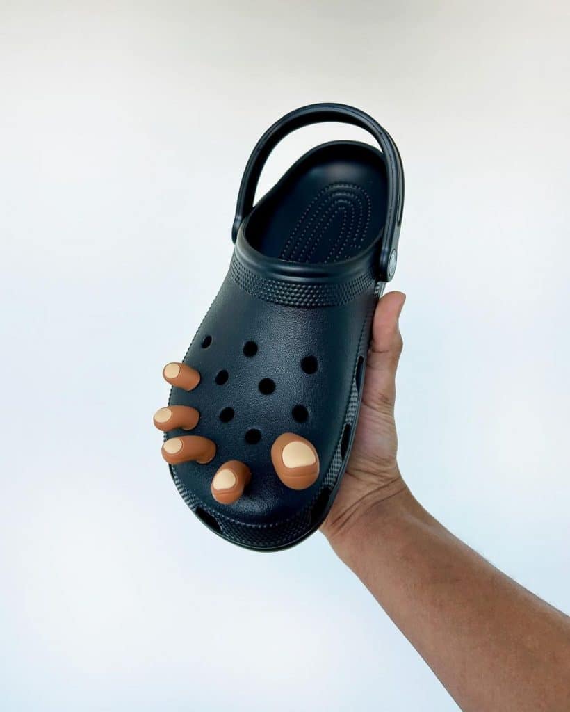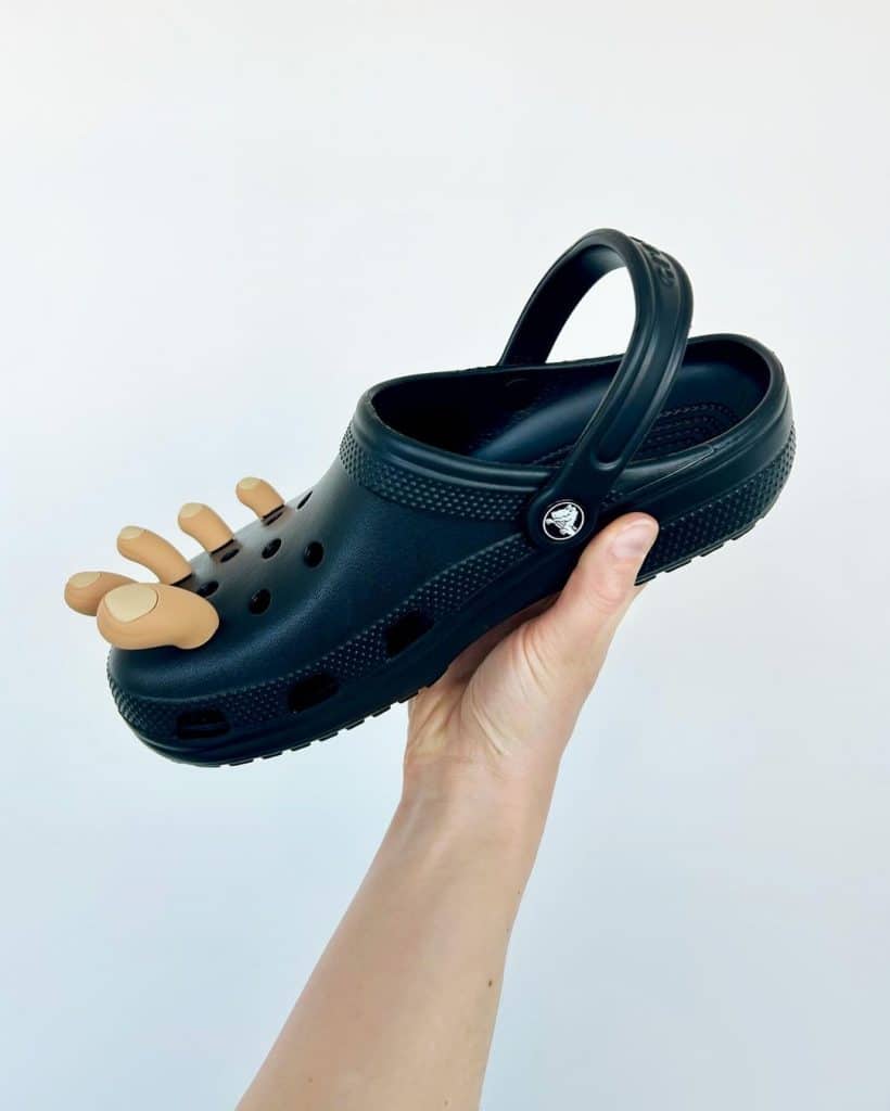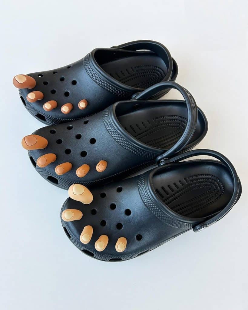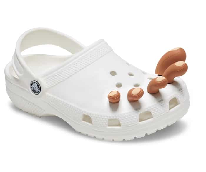Từng được xem là trò đùa Cá tháng Tư nhưng hoá ra mẫu Jibbitz charm này đang được bán trên trang web của Crocs. Mẫu phụ kiện này sẽ tạo ra ảo ảnh ngón chân người mang nhô ra khỏi lỗ thông gió của dép. Với 13 lỗ trên mỗi chiếc Crocs Classicm bạn có thể chơi tối đa 26 phụ kiện cùng một lúc, và tưởng tượng nếu toàn bộ là mẫu Toe Jibbitz! Bài đăng giới thiệu phụ kiện mới này thu hút hơn 30.000 lượt yêu thích trên Instagram của Crocs chỉ trong 2 ngày.
